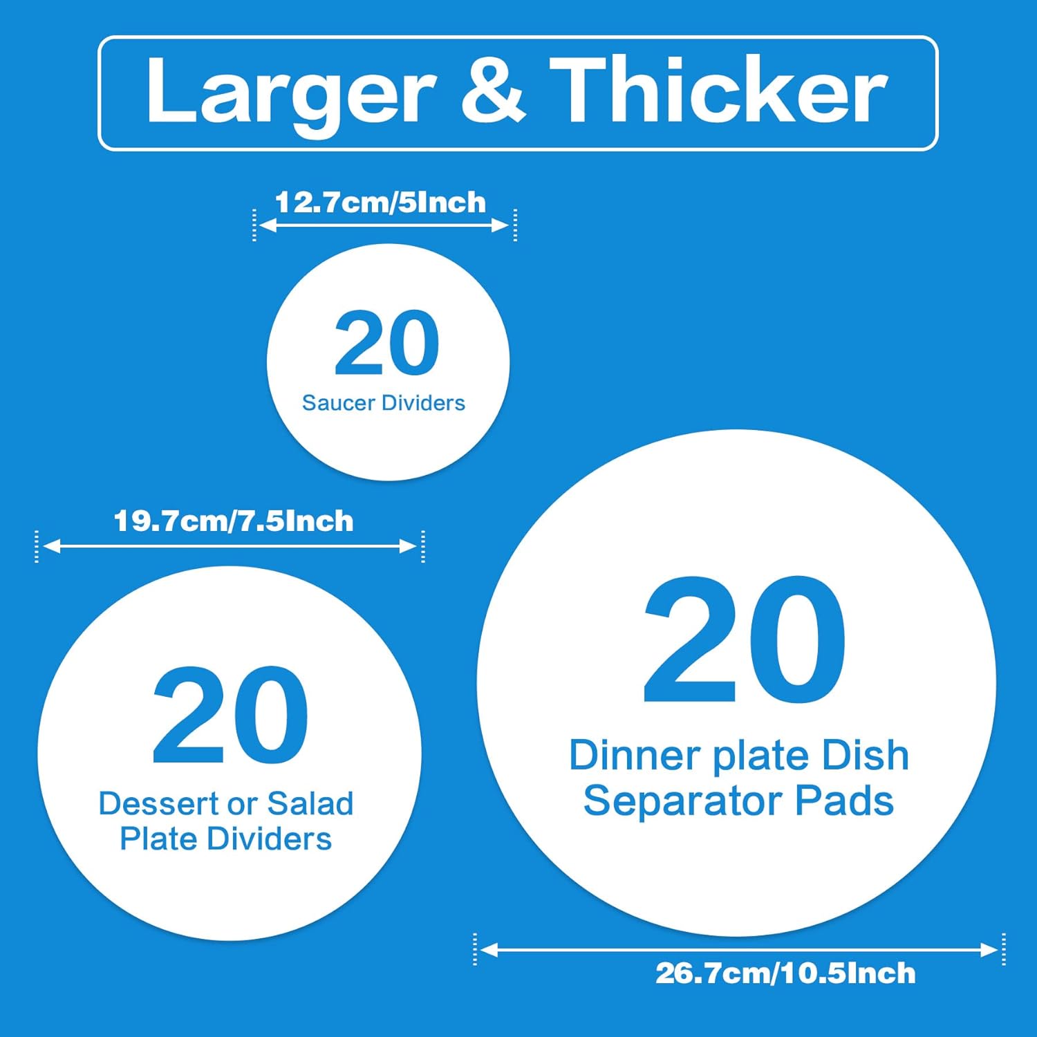 - 【60 Pieces China Storage Separators】Imncya Pan Separators for Stacking in small, medium, and large sizes. Includes 20 large protectors (10.5-inch diameter) for dinner plates, 20 medium (7.5-inch diameter) for dessert or salad plates, and 20 small (5-inch diameter) for coffee saucers