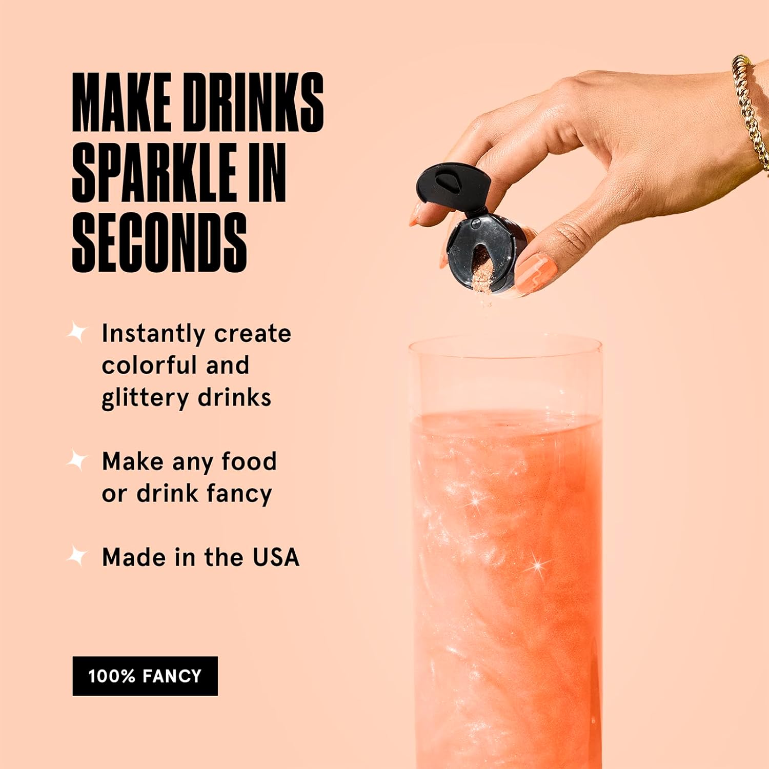- GLITTERY FOOD & DRINKS: Fancy Edible Glitter is a fine prismatic powder formulated for both food and drink. Add edible glitter to still and carbonated beverages and spirits to create a glittery hurricane, or dust onto desserts and savory items for a sparkly finish.