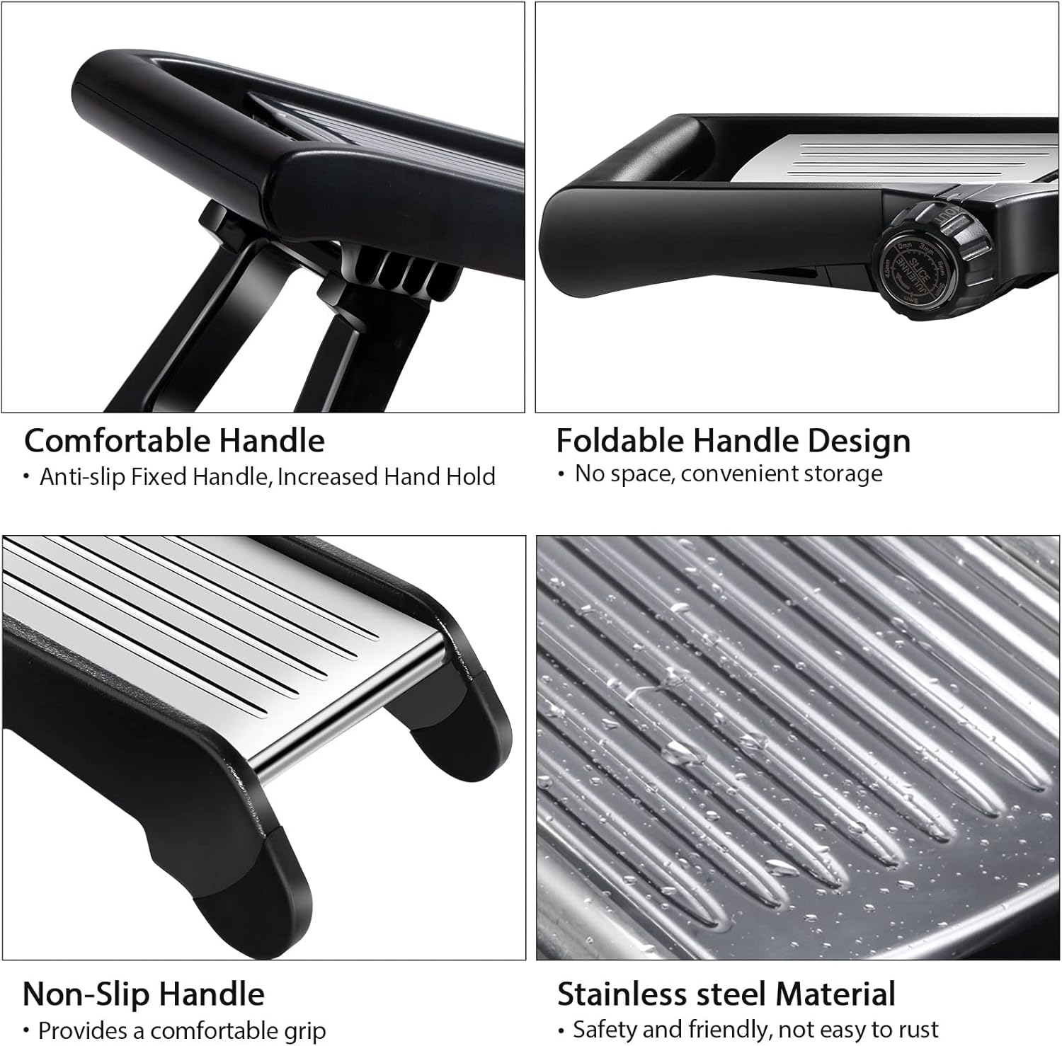 - Save Space:The blades are built-in and does not require extra space for storage. The support handle and anti-slip feet are foldable, making it comfortable to use and easy to fold and store. The slicer can be folded into a flat form for easy storage in a drawer.