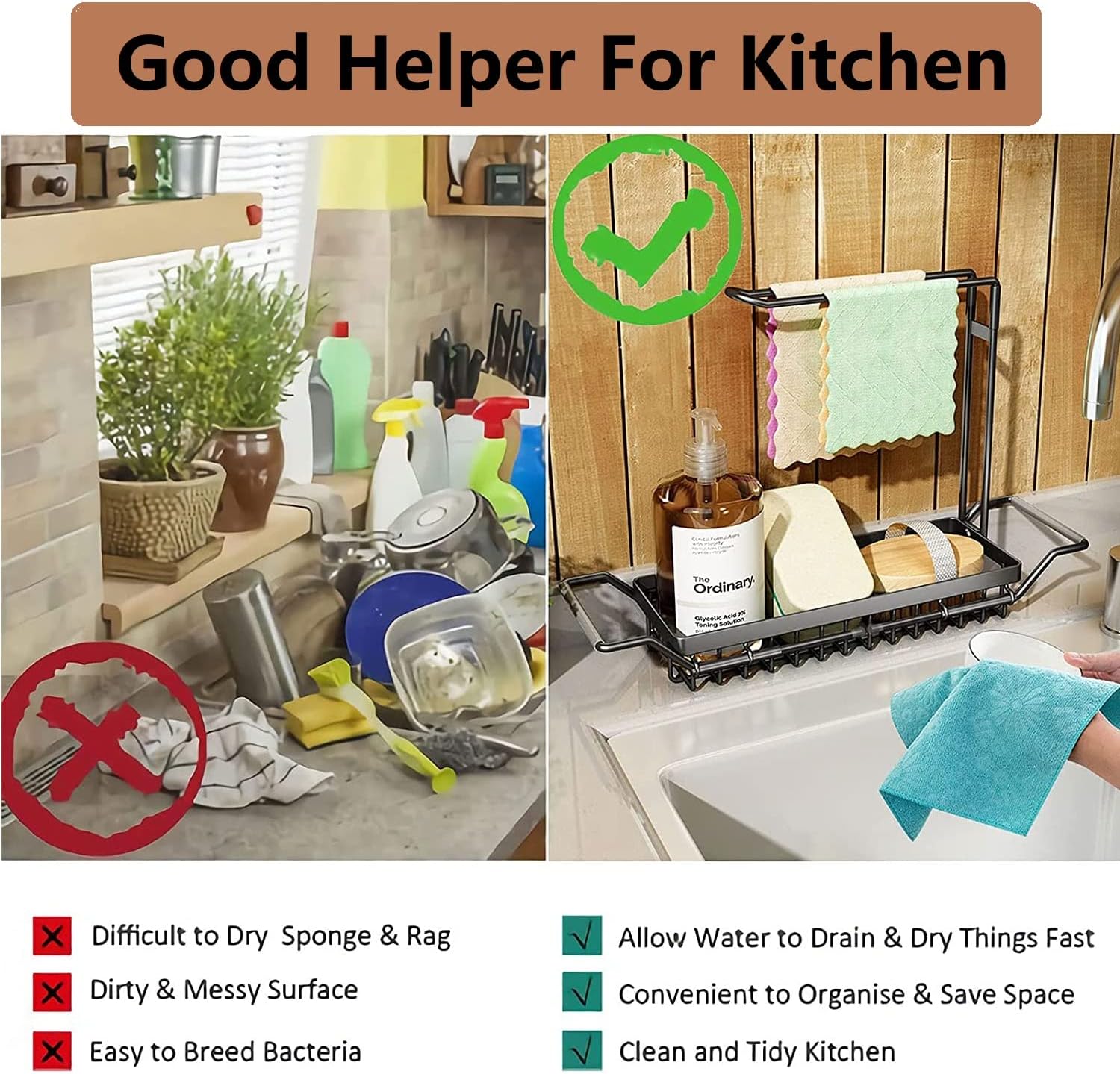 - ใ๐๐จ๐จ๐ ๐๐๐ฅ๐ฉ๐๐ซ ๐๐จ๐ซ ๐๐จ๐ฆ๐ ๐๐ข๐ญ๐๐ก๐๐งใ:Kitchen expandable sink storage rack holder can hold almost all the items you need for washing dishes, such as dishwashing sponges, dishwashing brushes, detergent, rags, sink plugs, etc, Two towels can be placed above the sink caddy of over the sink. This kitchen storage sink rack makes your kitchen sink more clean and tidy.