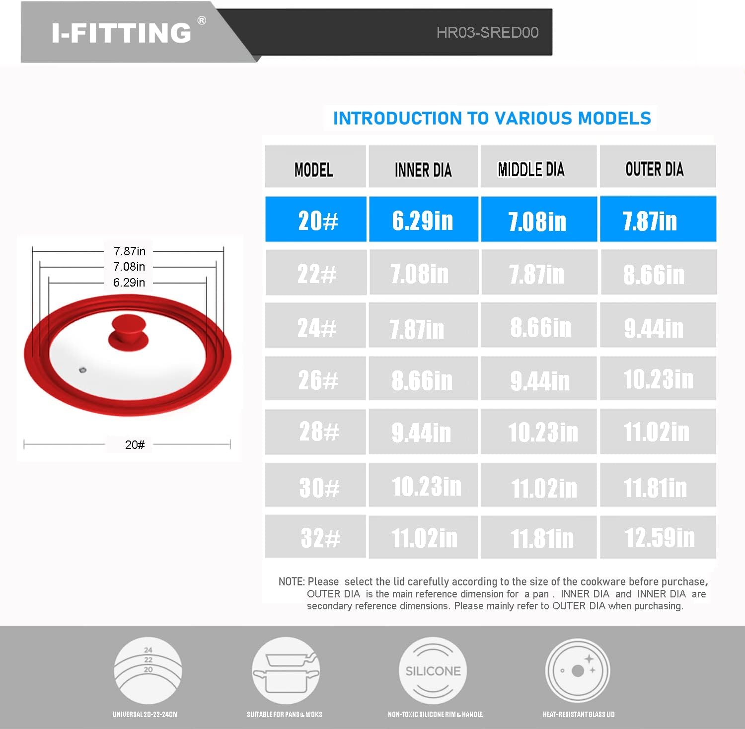 - 【UNIVERSAL LID WITH STEAM VENT】 Universal silicone glass cover lid suitable for pan/pot/skillet/saucepan/frying pan/soup pot , can fit 6.5", 7", 8” (16, 18, 20CM ) cookware. Designed with stainless steel steam vent, effectively prevent overflow during cooking