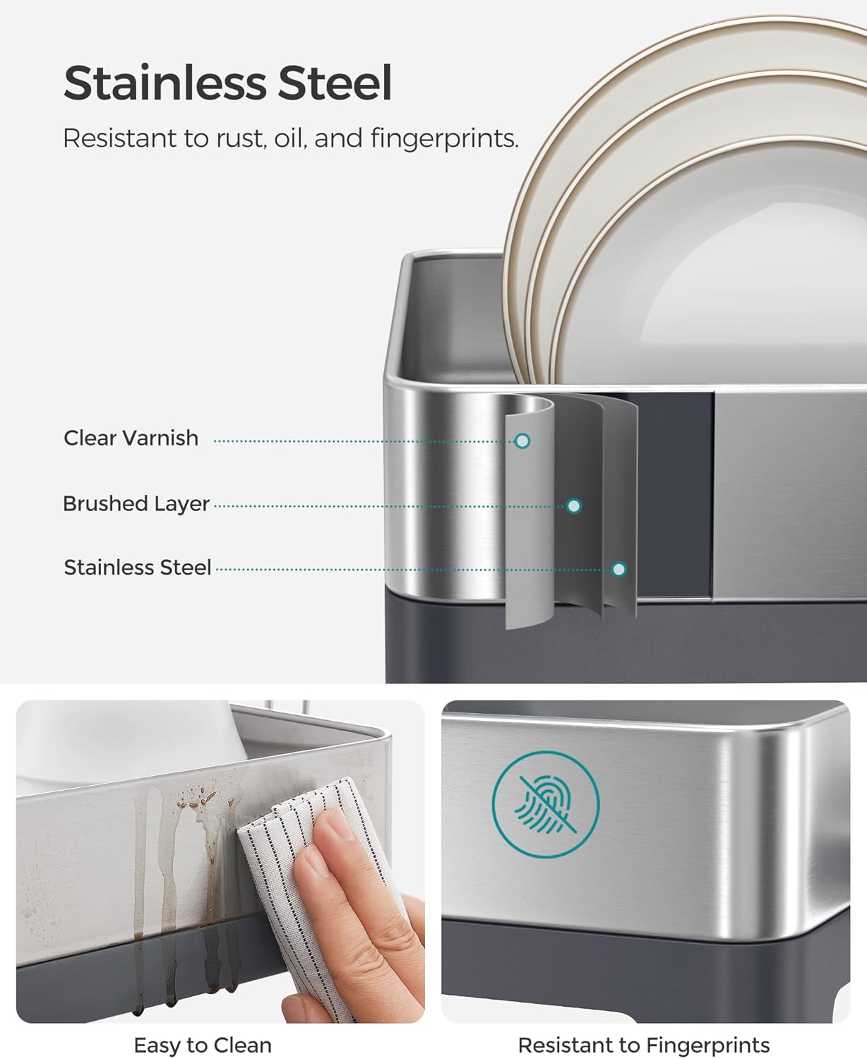- [Quality Stainless Steel] Built to withstand years of frequent use, this dish rack is made with brushed stainless steel which is rustproof, resistant to oils and fingerprints, and easy to clean with a simple wipe