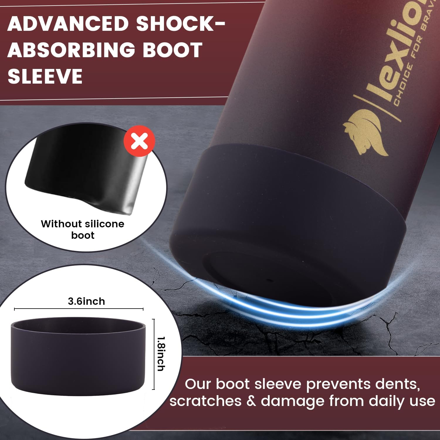 - ✅ SILICON BOOT/SLEEVE- Lexlion 32 oz stainless steel water bottle comes with an advanced shock-absorbing silicone material that helps to protect against dents, dings, scratches, and all the imperfections of your 32 oz insulated water bottle. You are protected against an inevitable drop in your water infuser bottle. This will extend the life of your flask. The infuser water bottle is BPA-free and made of soft and highest-quality material.