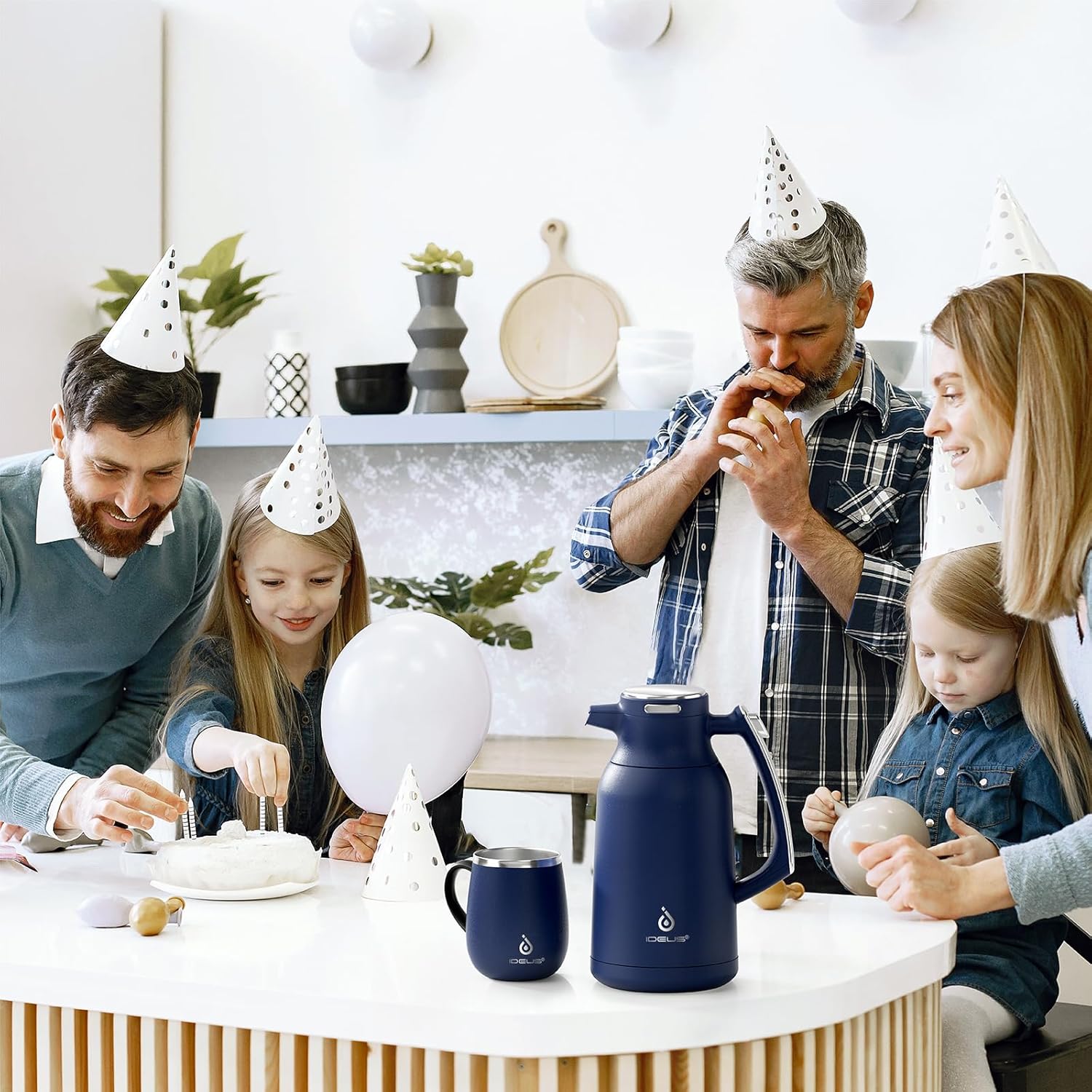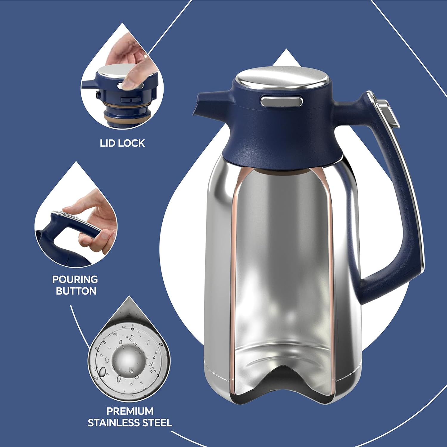 IDEUS Thermal Coffee Carafe 68oz (2,000ml), Stainless Steel Double Wall Insulated Vacuum Flask, Water Jug Coffee Server and Beverage Dispenser, Heat and Cold Retention (Navy Blue, 68oz (2,000ml))