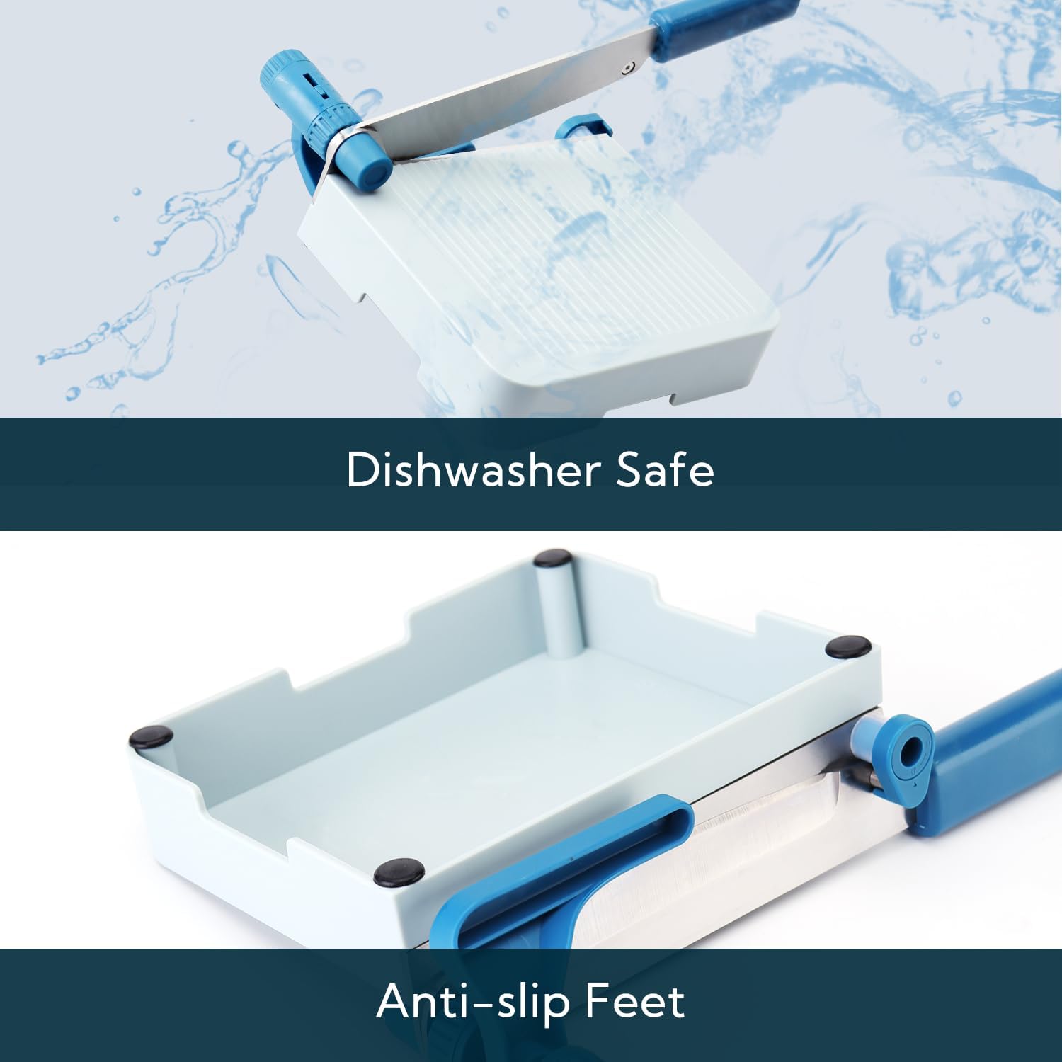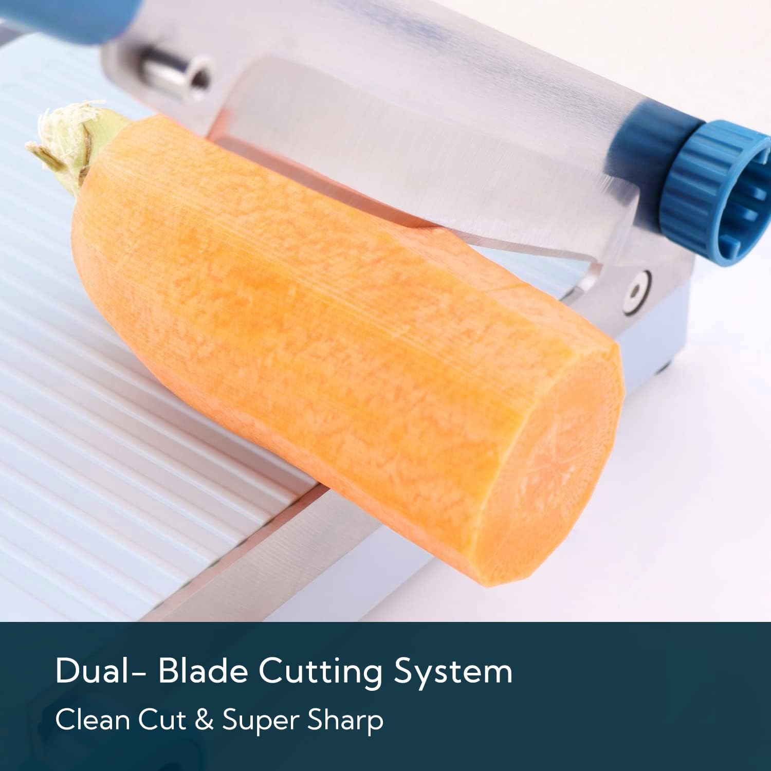 - Good for Seniors, Arthritic and Weak Hands with Dual-Blade Cutting System: This multipurpose food Slicer is designed with two super sharp blades which makes it super easy to slice not only semi-hard and hard cheeses, but can also cut other multiple food such as sausages, biltong/jerky, cucumbers, radishes, lettuce and more. Perfect for Seniors, arthritic and weak hands