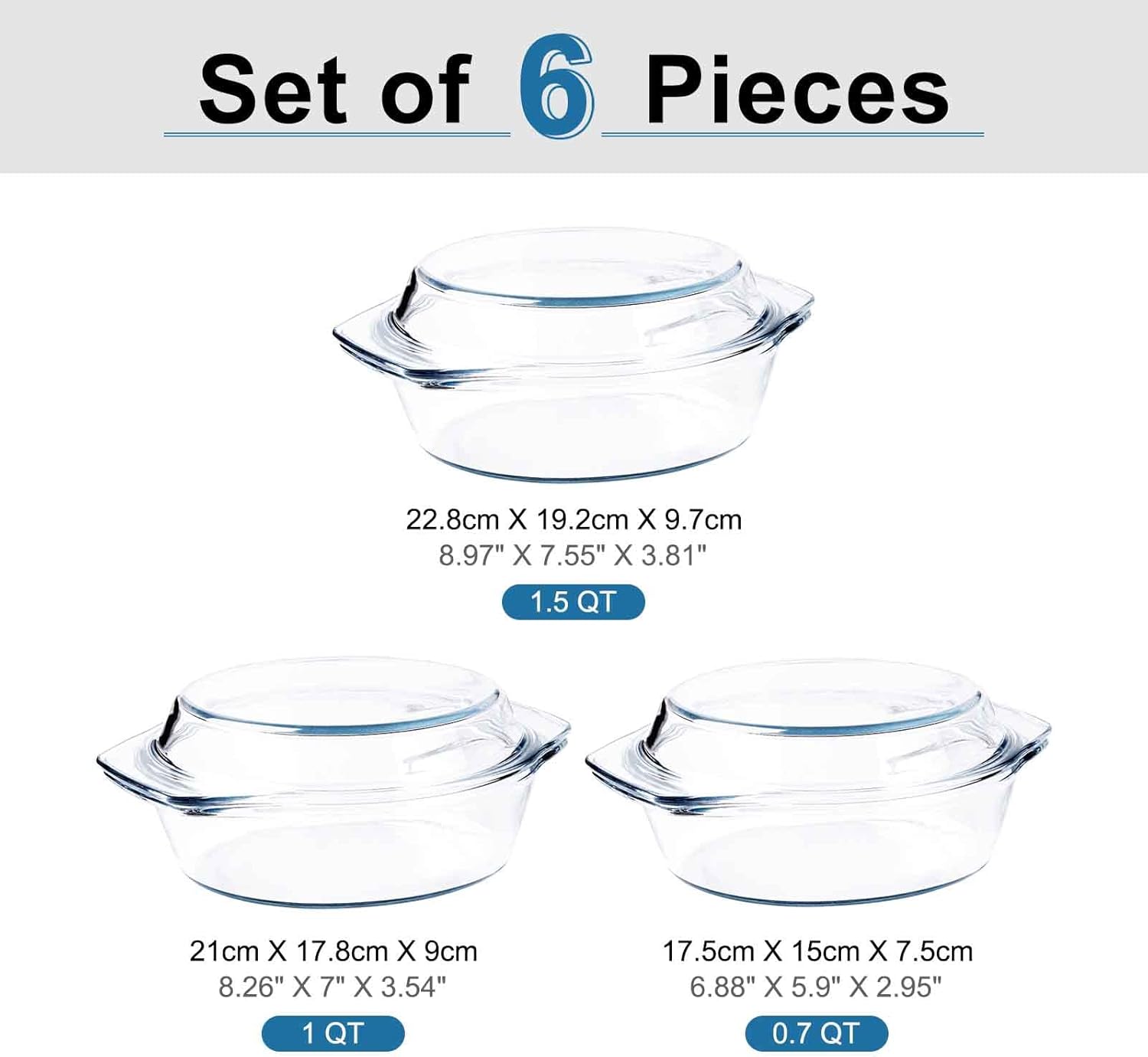 Set of 6 Pieces Round Tempered Glass Casserole Dish with Lids, Glass Casserole Baking Dish Set for Oven, Freezer and Dishwasher Safe - 0.7QT+1QT+1.5QT