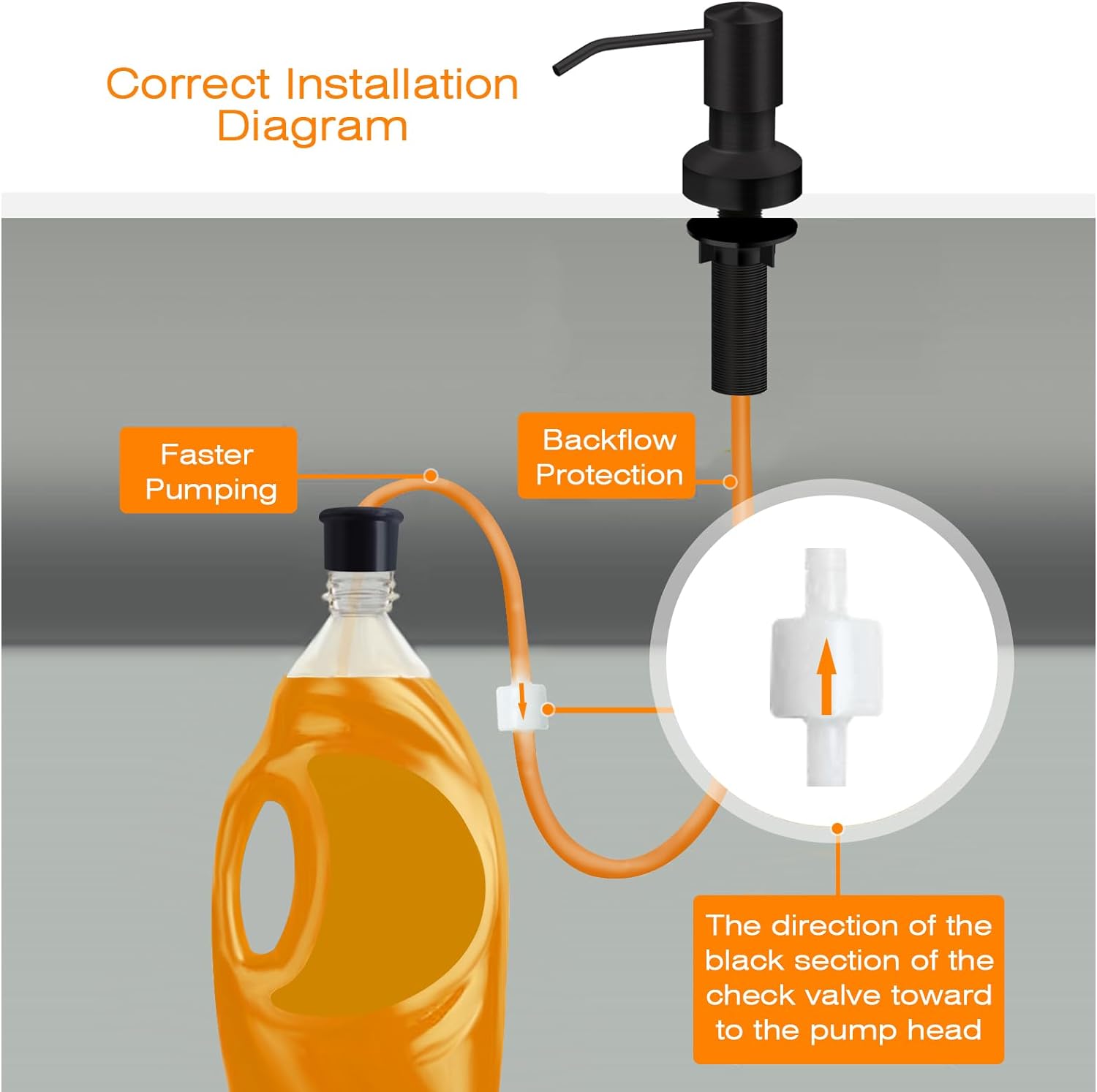 - What You Get: One soap dispenser pump head, 2 tubes, one bottle stopper to fit all soap containers, a check valve connects two-tube, anti-leak accessories and 3 fastening bolts.