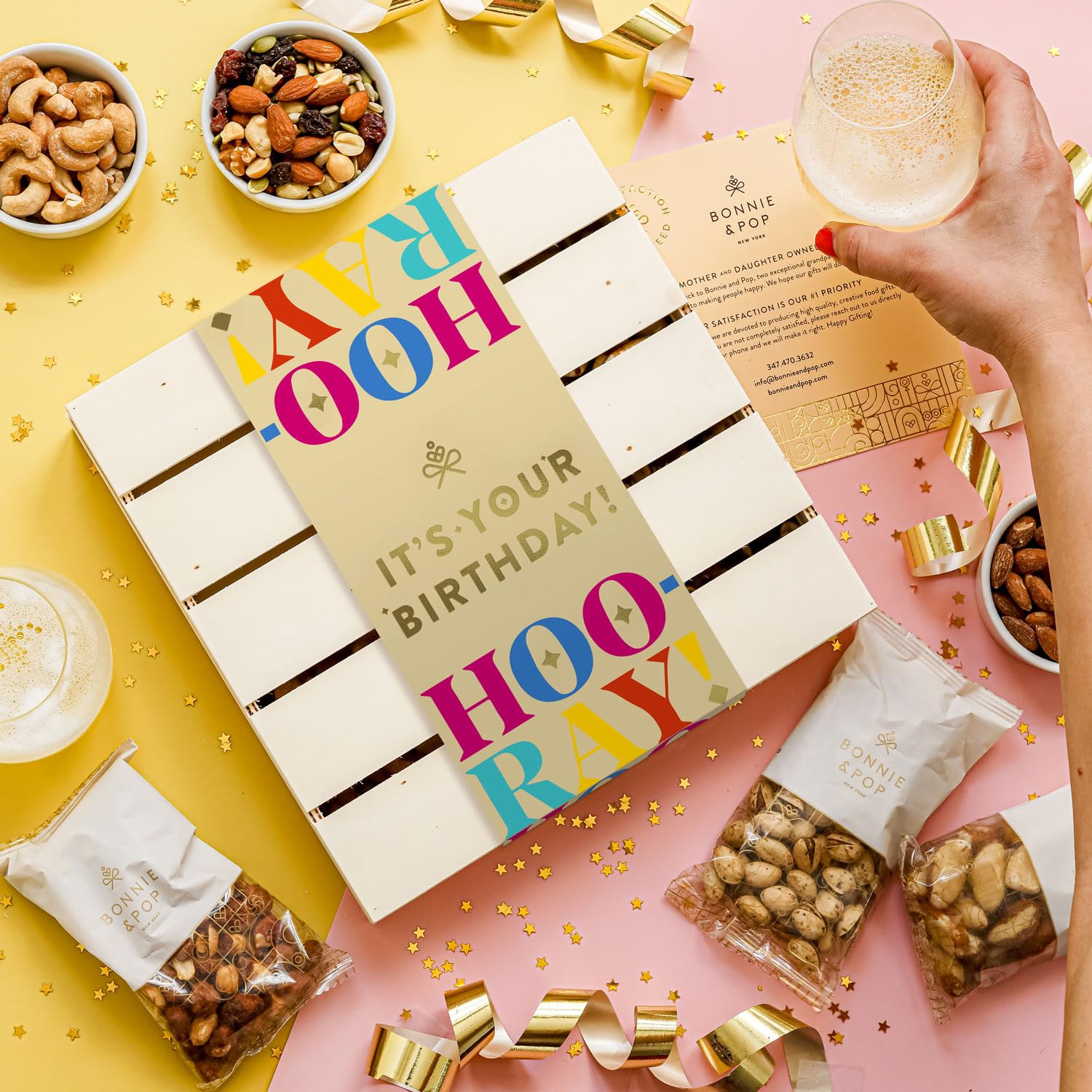 Happy Birthday Food Gift Basket, Healthy Nut Gift Tray, Birthday Snack Treat in Reusable Wooden Crate, Gourmet Assorted Food Delivery, Birthday Snack Box, For Men, Women and Families, Bonnie & Pop