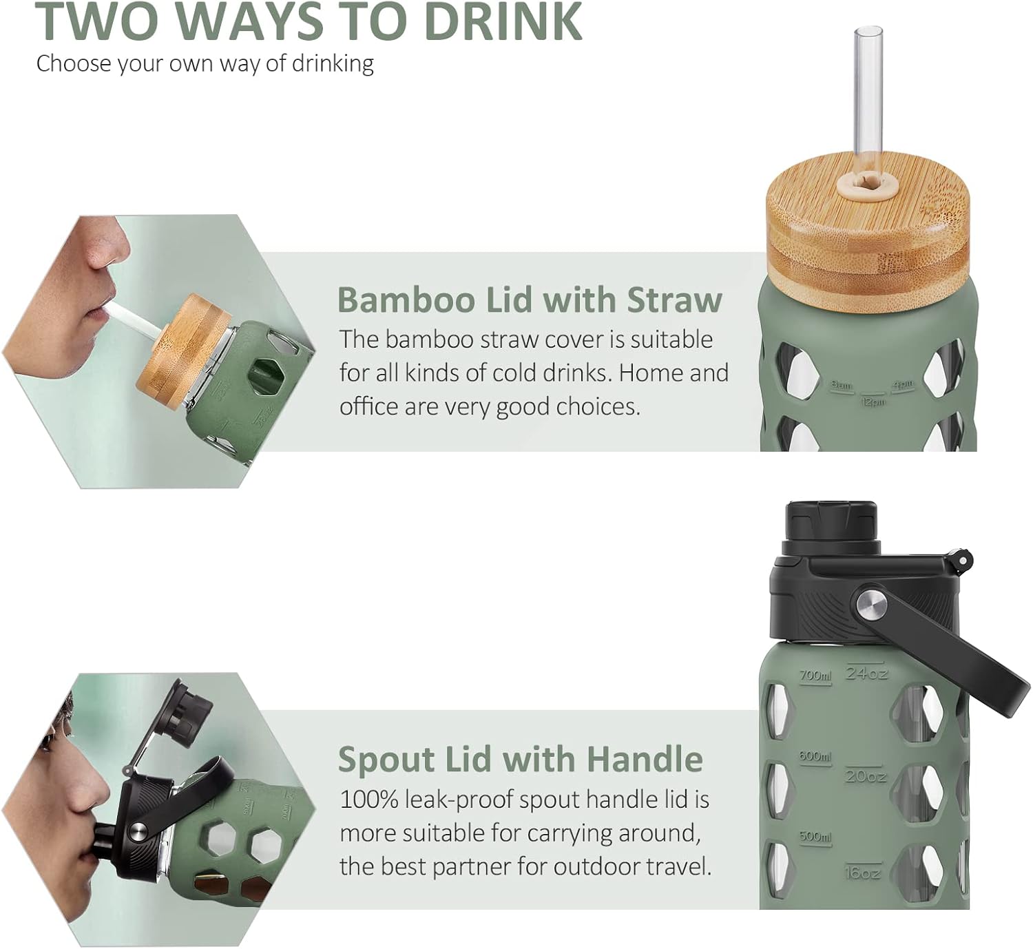 - TWO LID DESIGNS:Natural bamboo straw lid and leak-proof spout handle lid -The bamboo straw lid makes sipping more effortless, allowing for easy hydration throughout the day whether you're at the home or office.-The spout enables smooth liquid flow and the handle attached to the lid allows for easy carrying on the go.Suitable for gym and outdoors.