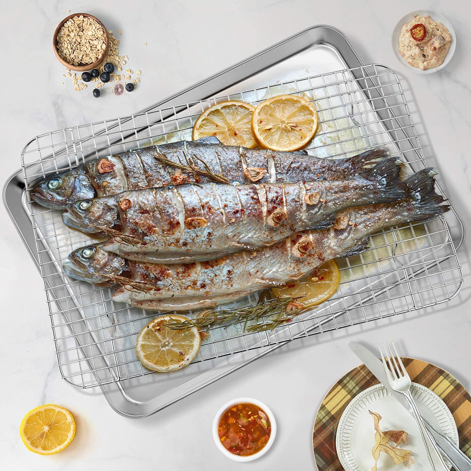 - ăMULTIFUNCTIONAL USEăBaking tray with baking rack are ideal for cooking, roasting or cooling, Using separately or together is on your choice to create endless possibilities of baking, Using together can keep grease on the pan and get crispy food on the rack, To be a perfect bakeware set of home or restaurant, A thoughtful present for family or friends on anniversary, birthday, wedding, or house-warming