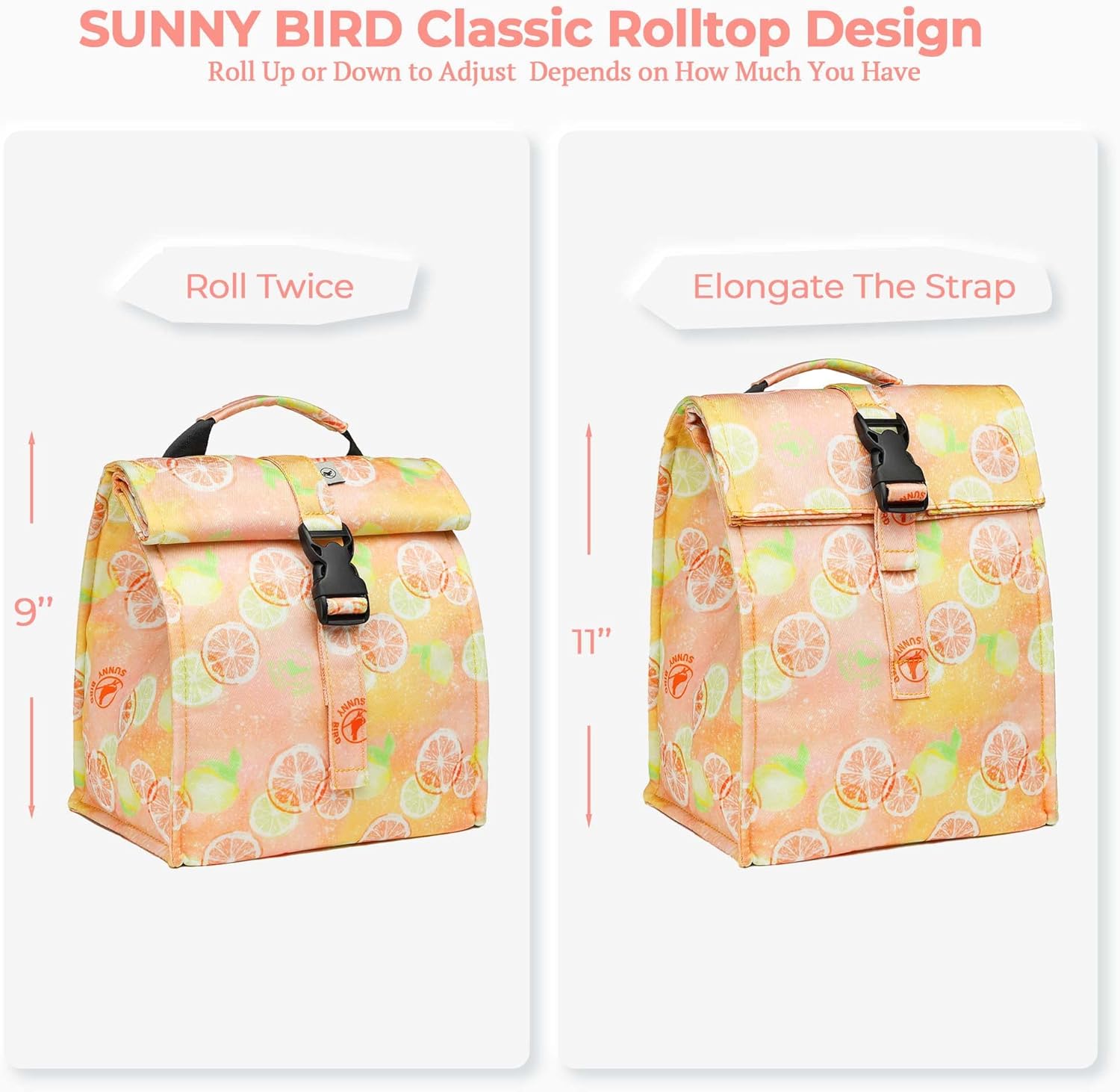 SUNNY BIRD Insulated Lunch Bag Rolltop Lunch Box Tote Bag for Women, Men, Adults and Teens (Grapefruit Pink)