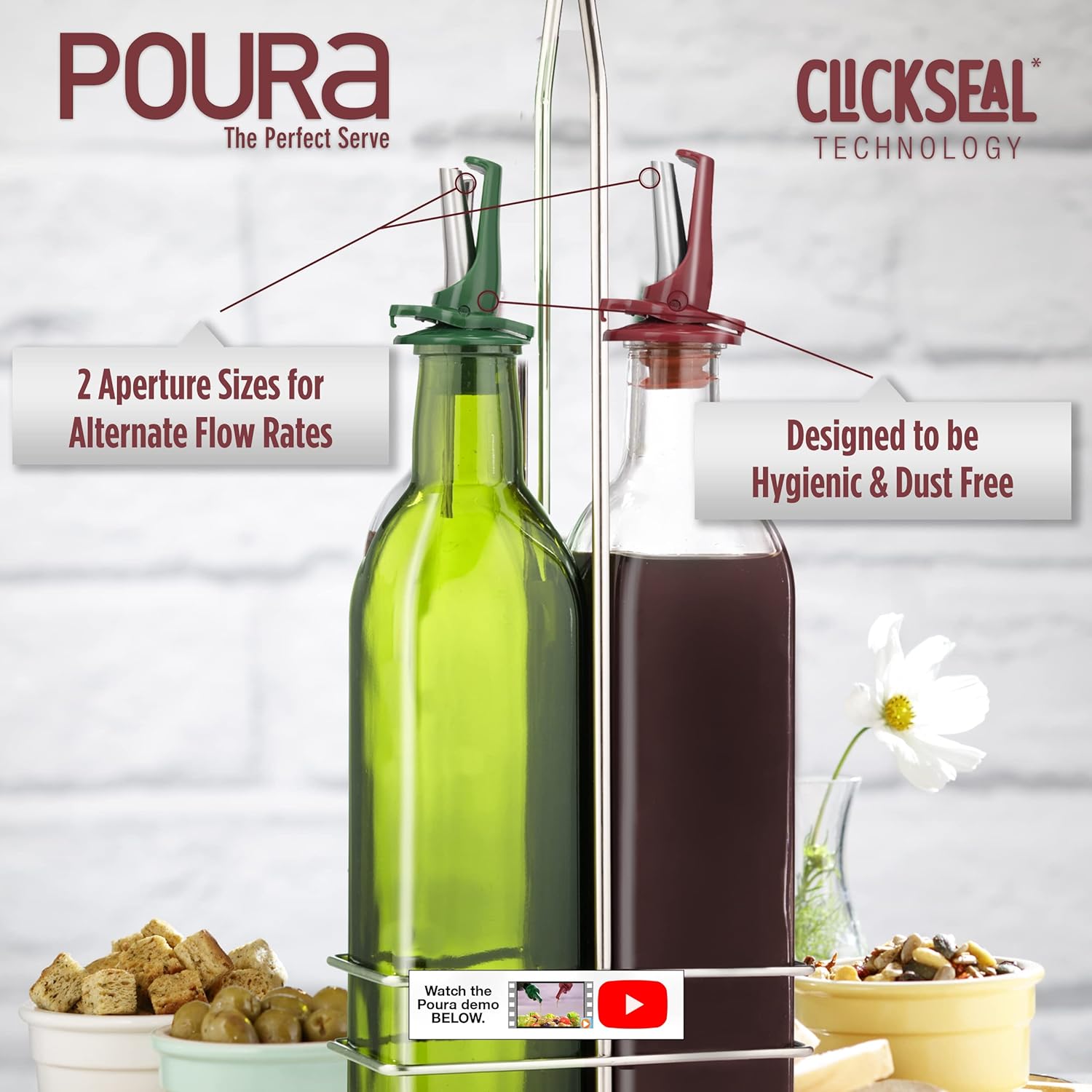 - ā TRANSFORM YOUR KITCHEN WORKFLOW - Poura's Advanced ClickSeal Technology Pourers are designed by a top chef & product designer team to look attractive in your kitchen & work for you while cooking - built to last with industrial quality materials. An elegant & easy to use olive oil and vinegar pourer set.