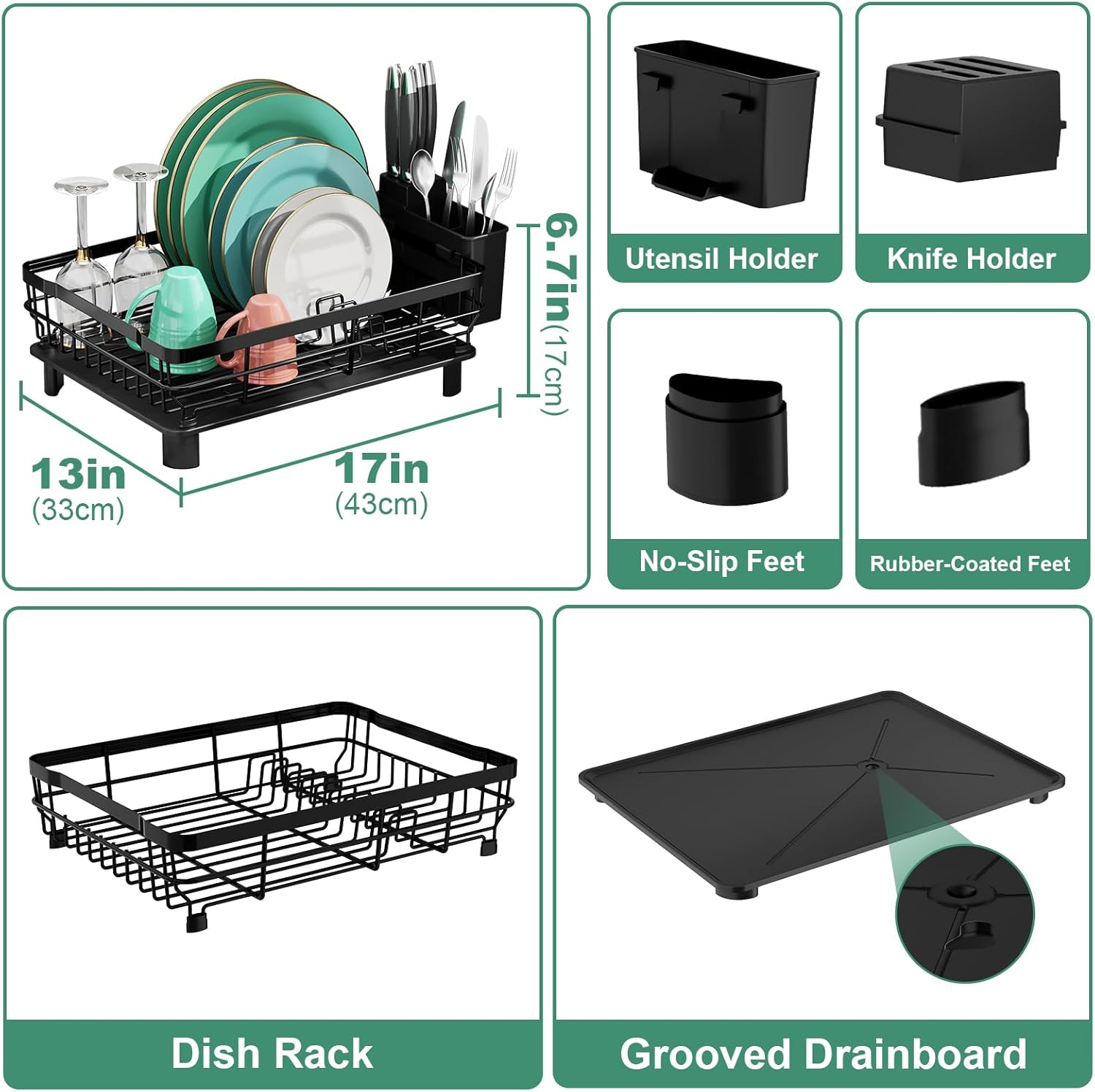 MOUKABAL Dish Drying Rack, Dish Rack, Stainless Steel Dish Racks for Kitchen Counter, Dish Drainer with Removable Utensil Holder, Drainboard (Black)