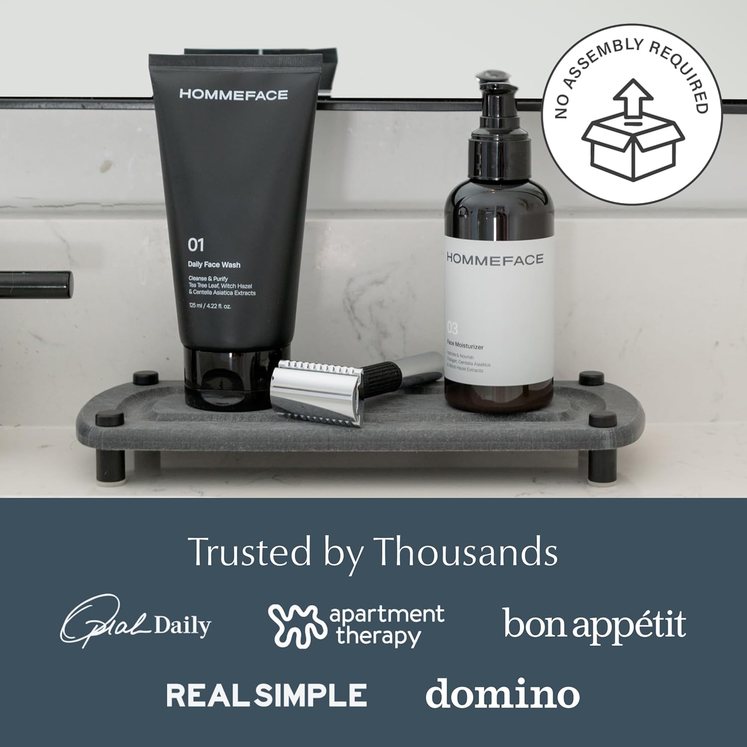 - CHIC STONE TRAY FOR BATHROOM COUNTER - Combining style with functionality, our fast-drying stone sink tray is the ultimate addition to your kitchen or bathroom. Designed with stainless steel feet with a rubber bottom, it withstands moisture effortlessly. With its modern, minimal look, it provides a harmonious balance between form and function.