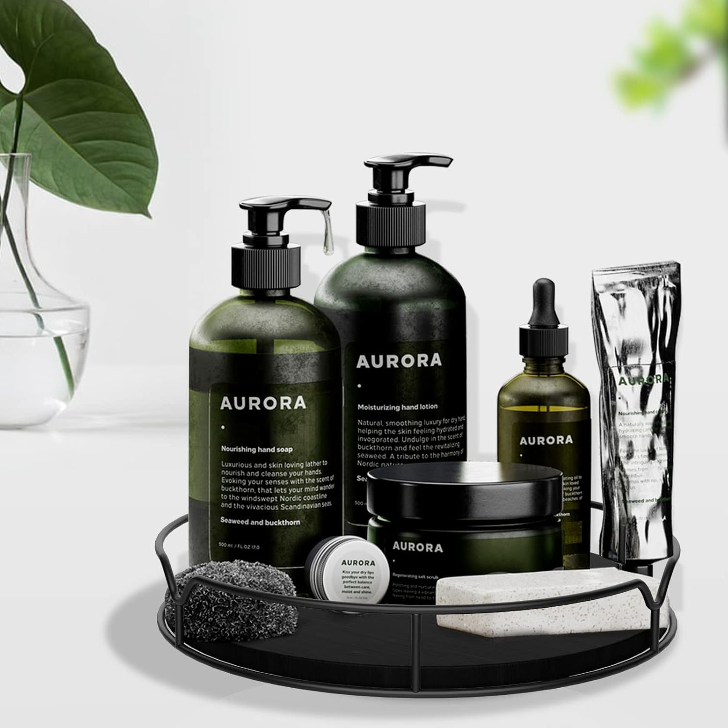 Lazy Susan Turntable Organizer with Anti-Slip Mat for Cabinet Pantry Kitchen Countertop Refrigerator Office, Pine Wood, 10", Black