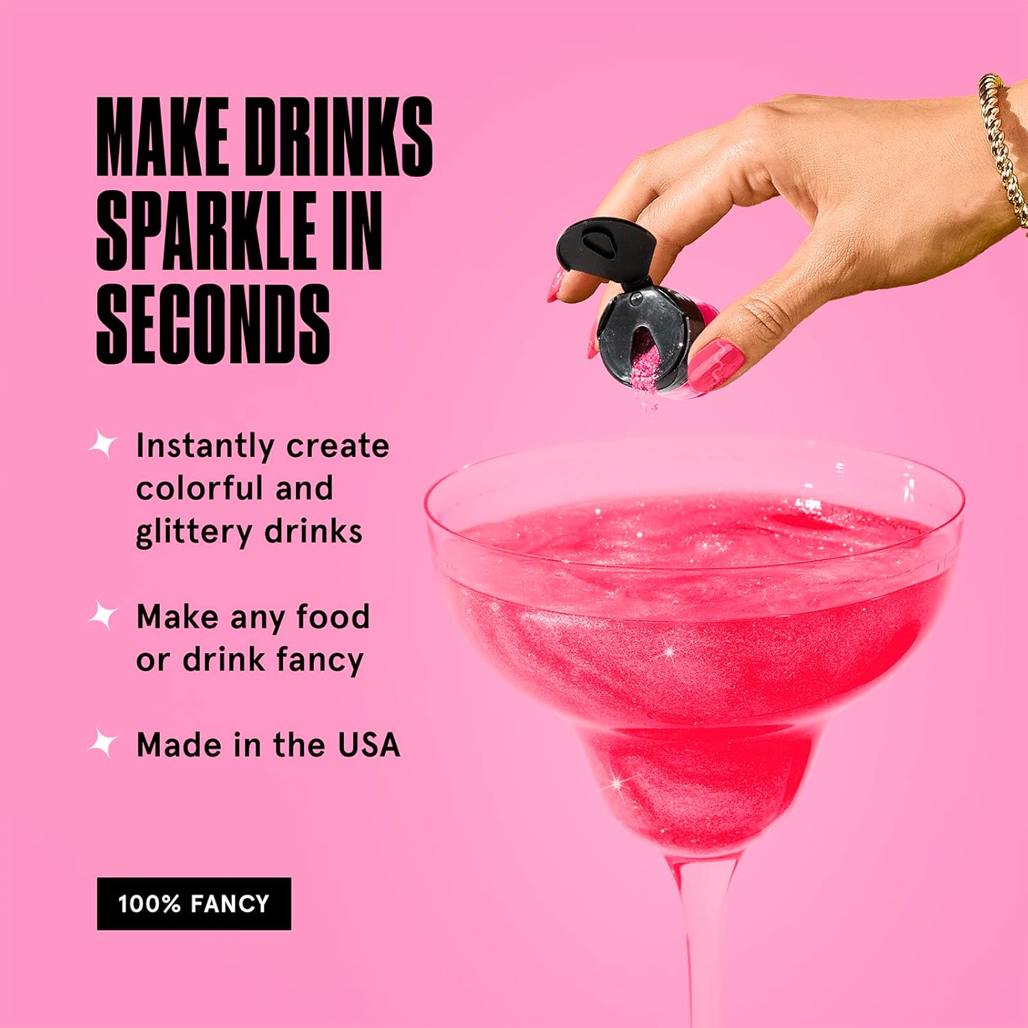 - GLITTERY FOOD & DRINKS: Fancy Edible Glitter is a fine prismatic powder formulated for both food and drink. Add edible glitter to still and carbonated beverages and spirits to create a glittery hurricane, or dust onto desserts and savory items for a sparkly finish.