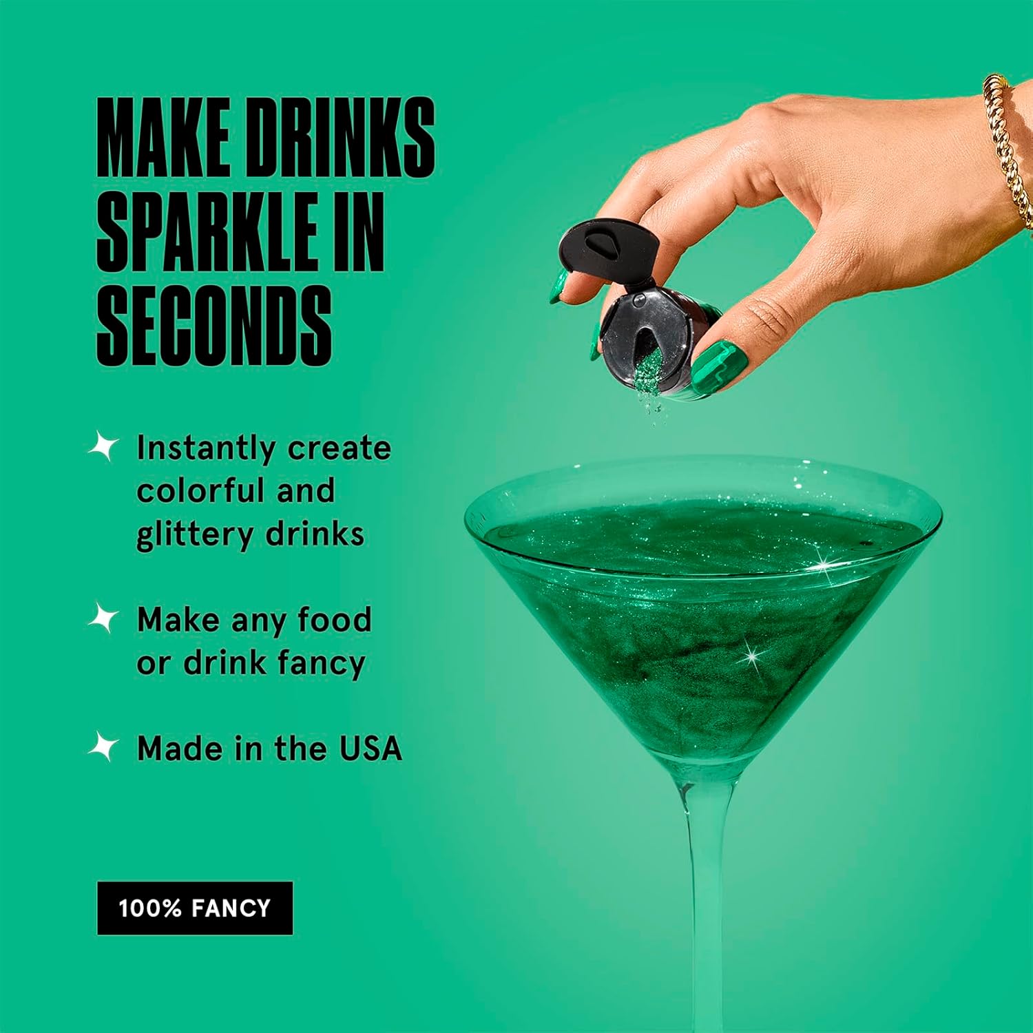 - GLITTERY FOOD & DRINKS: Fancy Edible Glitter is a fine prismatic powder formulated for both food and drink. Add edible glitter to still and carbonated beverages and spirits to create a glittery hurricane, or dust onto desserts and savory items for a sparkly finish.
