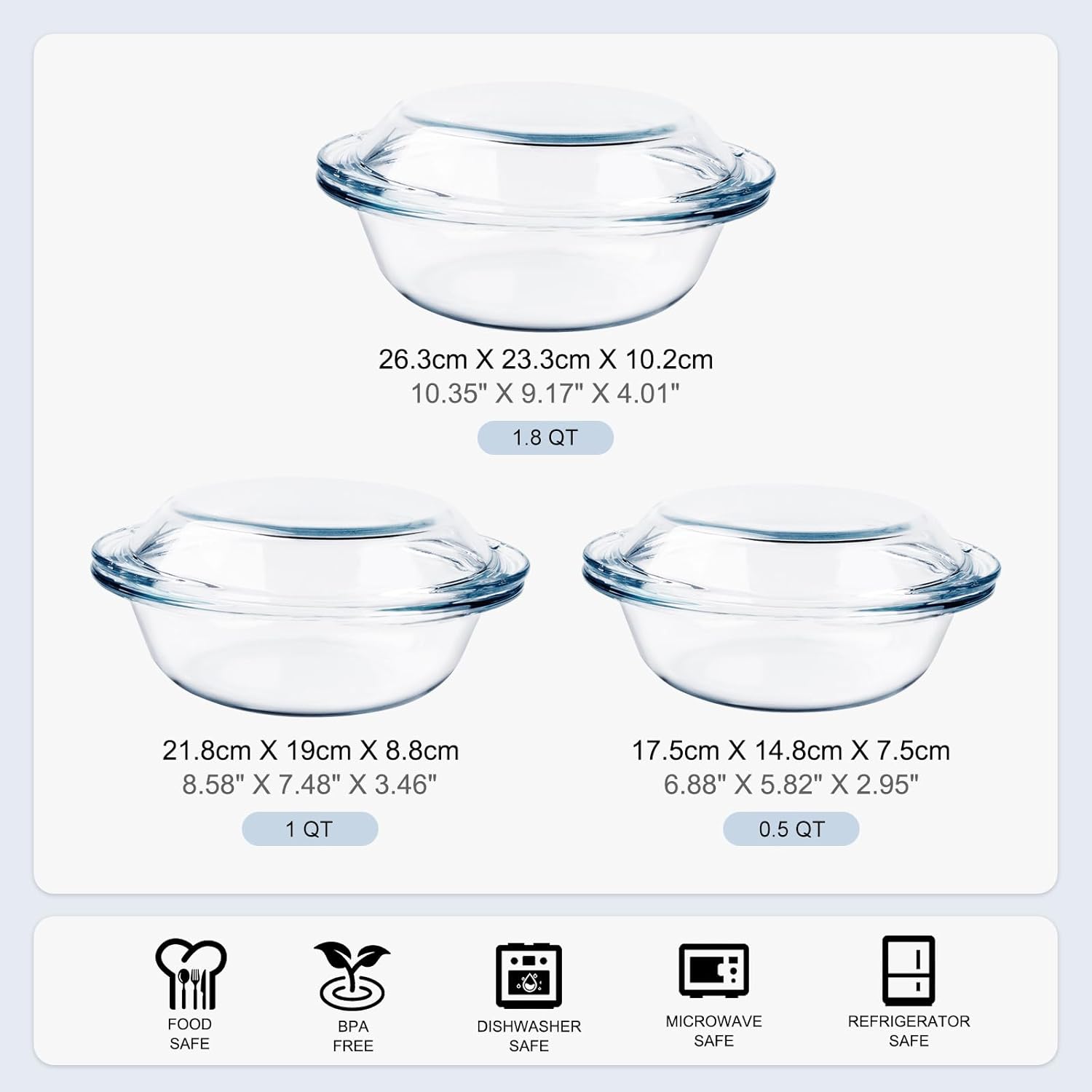 Set of 6 Round Glass Casserole Dishes, Nesting Glass Baking Dish Set with Lid, Oven, Freezer and Dishwasher Safe. - 0.5QT+1QT+1.8QT