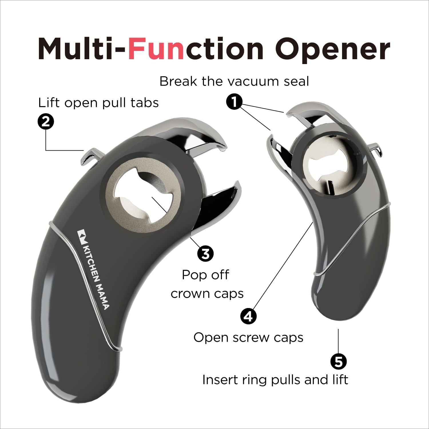 Kitchen Mama Epic One Multifunction Opener: Magnetic Bottle Opener, Beer Soda Opener, Effortless Jar Lid Opener for Seniors Elderly with weak Hand and Arthritis, Essential Kitchen Gadget (Metal Gray)