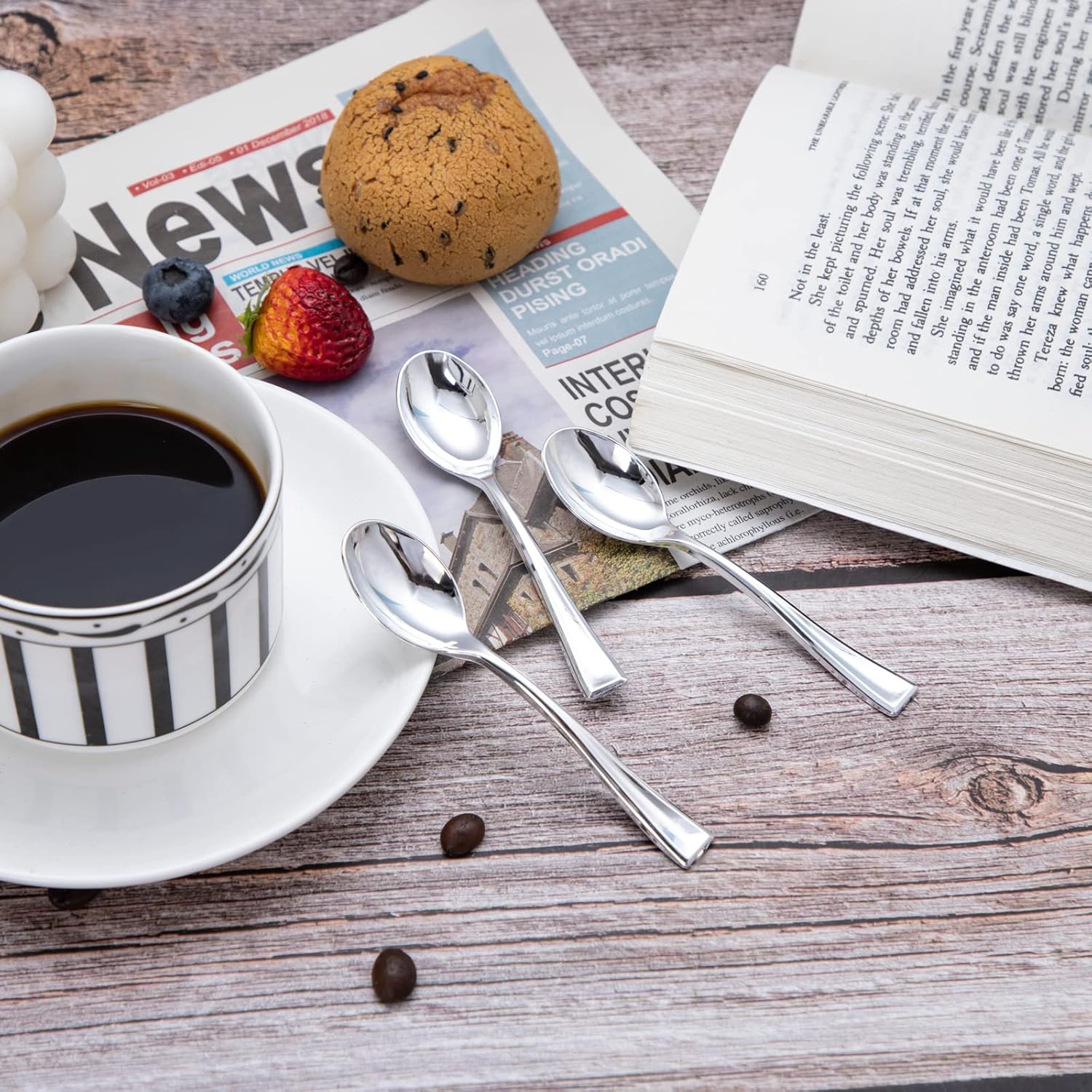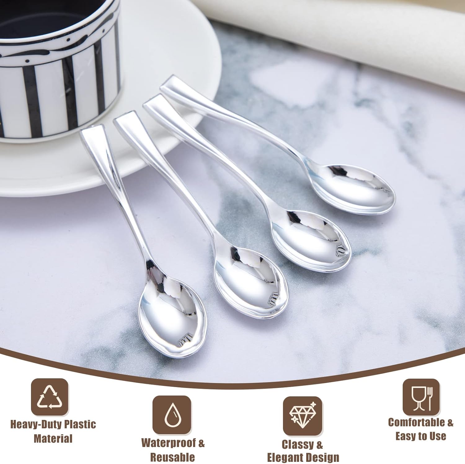 WDF 300 Pieces Plastic Silver Mini Spoons - 4 Inches Silver Plastic Tasting Spoons for Desserts, Heavy Duty Disposable Spoons Perfect for Coffee, Cake, Desserts, Appetizers for Wedding/Party