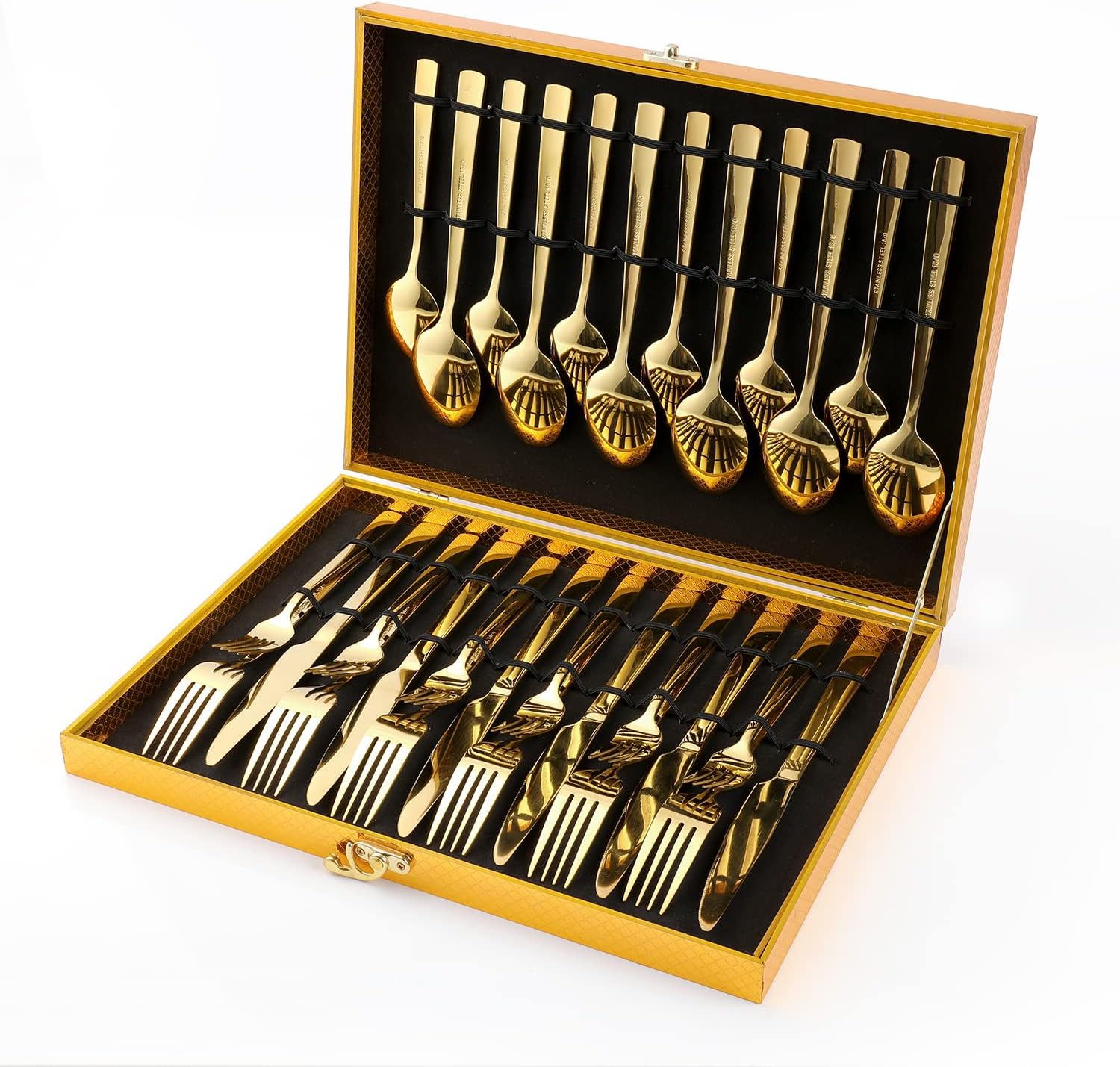 - ăFOOD-GRADE 18/8 STAINLESS STEELă: The gold flatware set is made of 18/8 stainless steel which is durable and corrosion-resistant, rust-proof, non-toxic, BPA-free, healthy for your daily use. At the same time, good sturdiness ensures that it will not bend easily and always maintain a beautiful appearance.