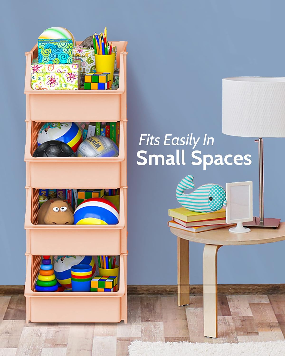 - KEEPS ESSENTIALS ORGANIZED AND VISIBLE - Our stackable bins hold foods, toys, utensils, and toiletries without bending off. Each bin has dimensions of 11.5 x 14.5 x 7 Inches and a set of 4 packs, has dimensions of 11.5 x 14.5 x 27.5 Inches.