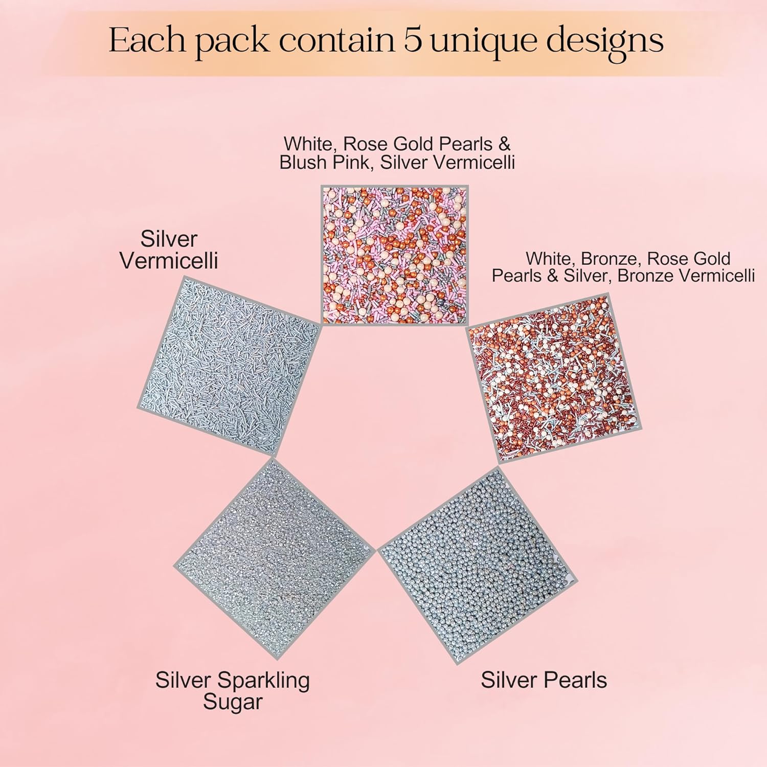 - Confect Sprinkles are made with the finest quality Ingredients & are soft to chew Sprinkles come in a unique pack of 5 assorted colors and sizes.