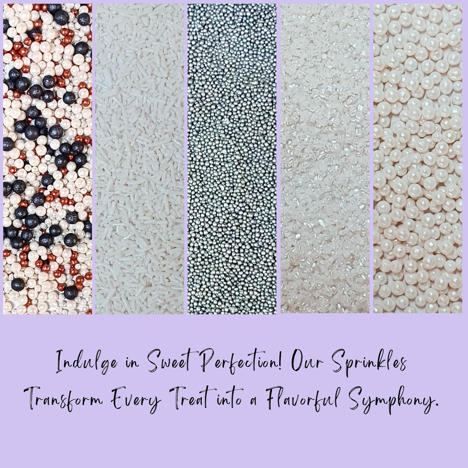 Confect White Sprinkles | Sprinkles for Cakes & Cupcakes Decoration | Assorted pack of 5 | Mix Black, Bronze & White Dragees Pearl , Jimmies & Sparkling Sugar | Vegan, Gluten-Free, Nut-Free, Soy-Free, Dairy-Free, Palm Oil-Free- 5 Oz