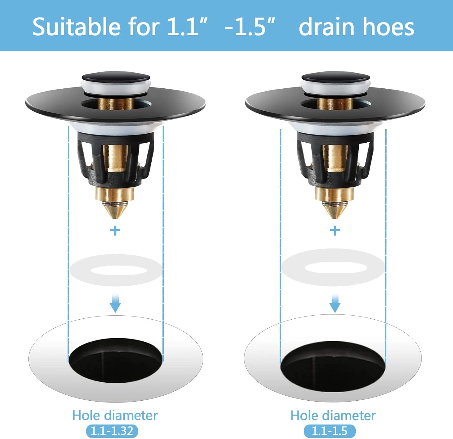 - 【PERFECT COMPATIBILITY】Black pop up drain stopper for bathroom sink is designed with a new small diameter (1.1~1.5 inch inner diameter), our 2 silicone rings ensure a perfect fit with various drain holes, conforming to most US standards 1 1 /8" ~1 1/2" sink drain holes (depth: about 1.5")Other similar products are too large for American sinks.