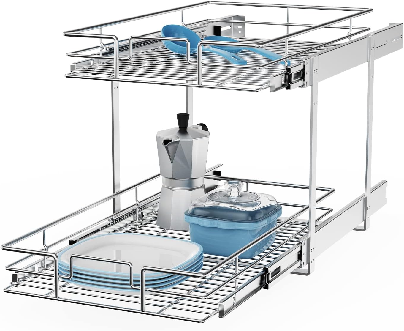 ROOMTEC Individual Pull Out Cabinet Organizer (14" W x 18" D), 2 Tier Spice Rack Organizer for Cabinet, Slide Out Drawer Pantry Shelf Organization and Storage for Kitchen Bathroom