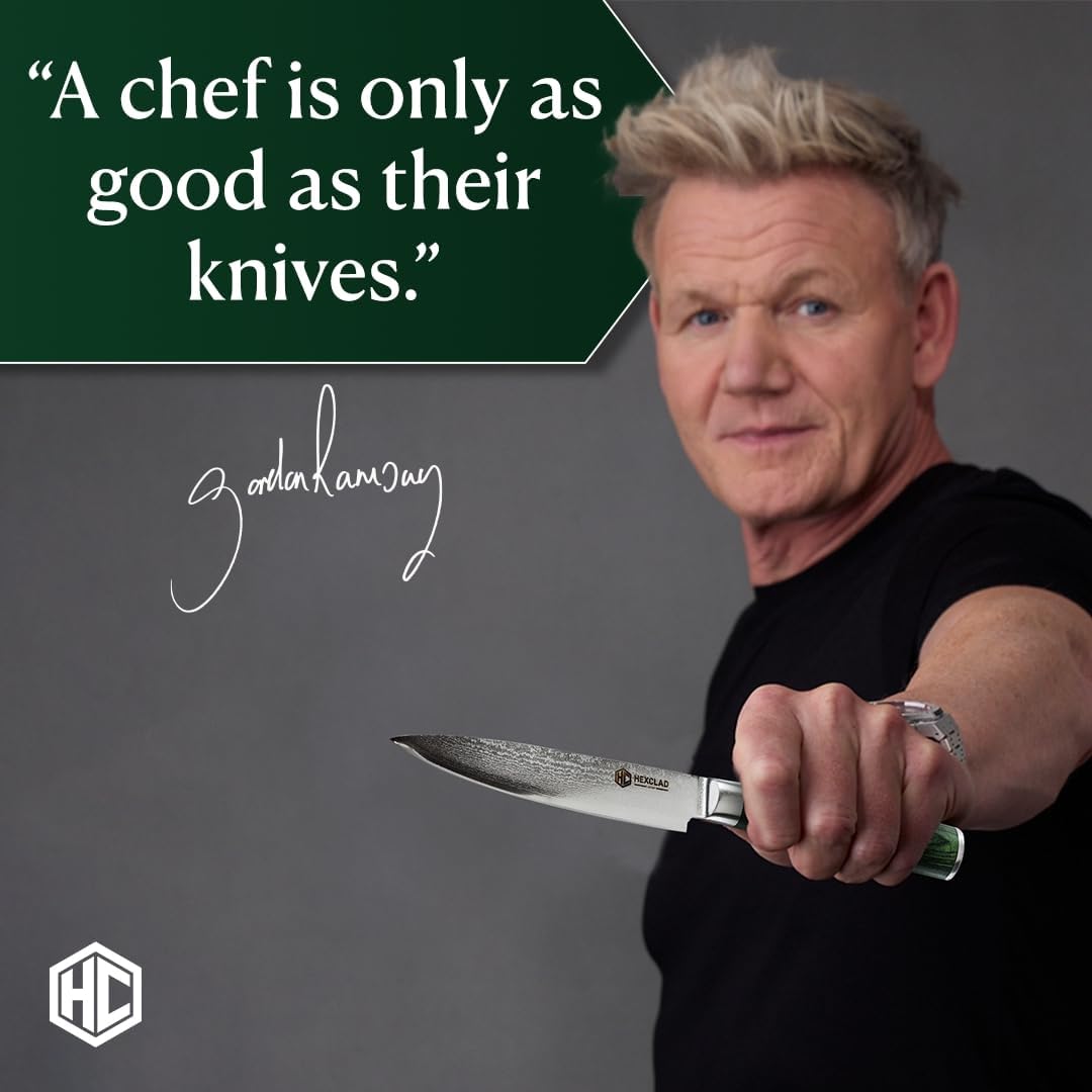 - 67 layers of Damascus steel for a harder blade that stays sharper longer with an ergonomic Pakkawood handle for precision and control. Made utilizing the 3-step Honbazuke method – an advanced heat treatment to achieve a combination of hardness and flexibility that creates an exceptional 12-degree cutting edge.