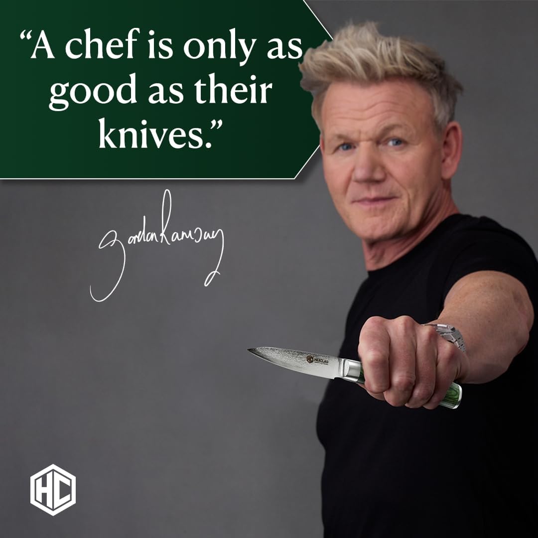 - 67 layers of Damascus steel for a harder blade that stays sharper longer with an ergonomic Pakkawood handle for precision and control. Made utilizing the 3-step Honbazuke method β an advanced heat treatment to achieve a combination of hardness and flexibility that creates an exceptional 12-degree cutting edge.