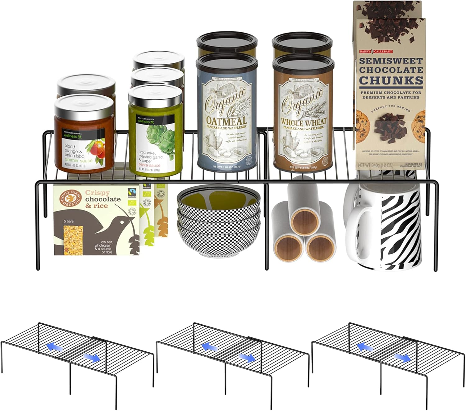 Redrubbit Cabinet Storage Shelf Rack, 8 Piece Expandable Metal Rustproof Kitchen Counter and Cabinet Shelf, Storage Rack Organizer Space Saver for Kitchen, Fridge, Cabinet, Bathroom, Black, Set of 4