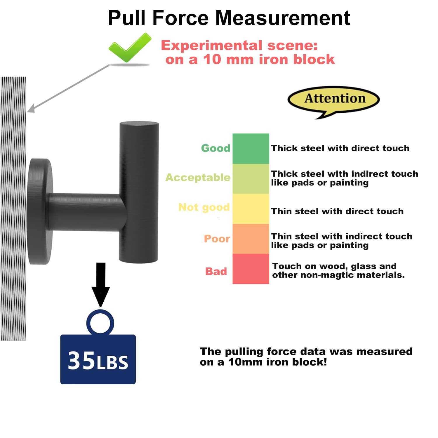 - 【Powerful Magnet】: MHDMAG magnetic hooks 1.78in diameter and 2.41in height, its magnetic strength could reach about 140 lbs in vertical and 35lbs in horizontal in ideal conditions. But please note the magnet strength is affected by the metal thickness and smooth of the attached items or high-temperature environment or acid-base environment.