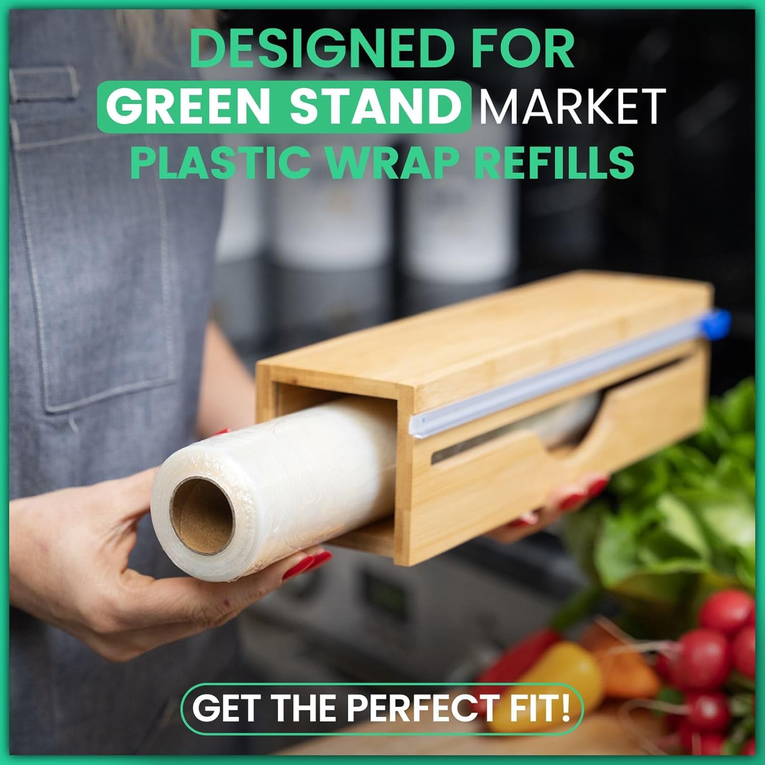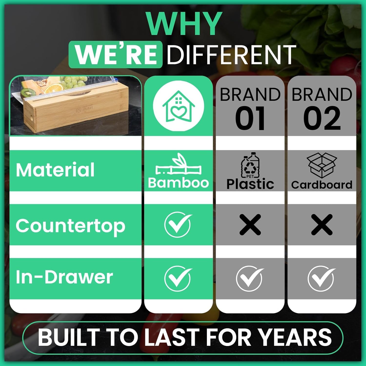 - STURDY: The bamboo foil dispenser with cutter is heavy enough to stand on the counter. Freeing a hand up and quickly wrapping what you need. No more fighting with the box for plastic wrap.