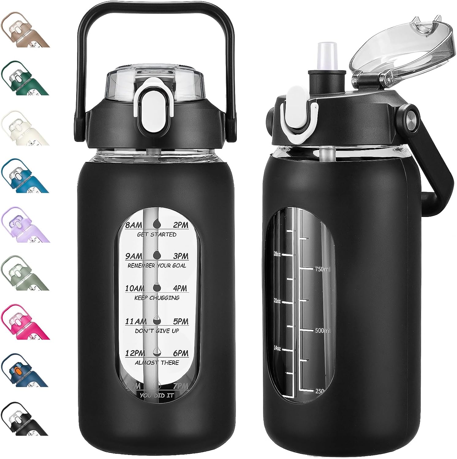 - ❤High-Quality Borosilicate Glass Bottle- This large motivationla water bottle is made of odorless, quality, borosilicate glass. Straw and lid are made of food-grade PP, BPA-free and eco-friendly.