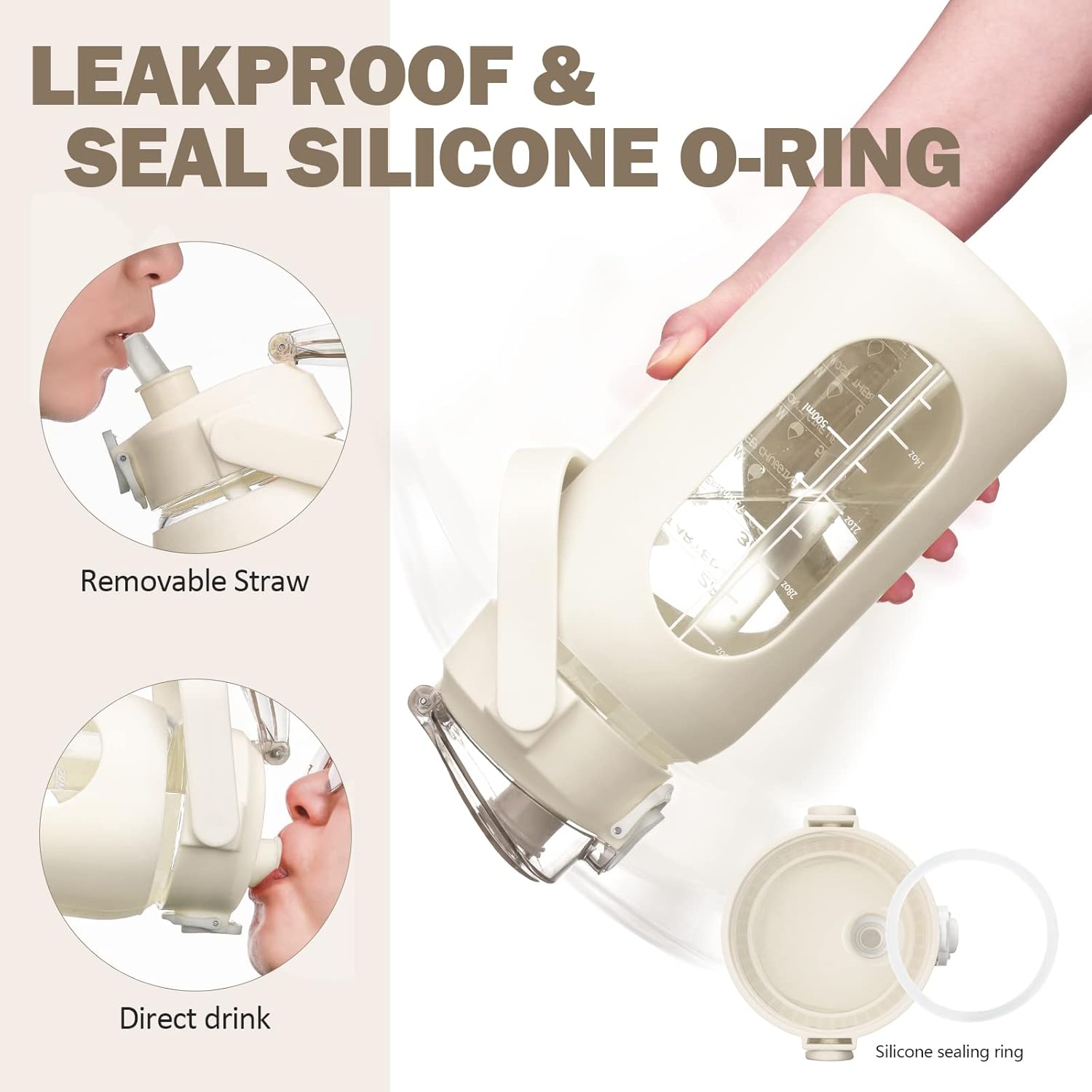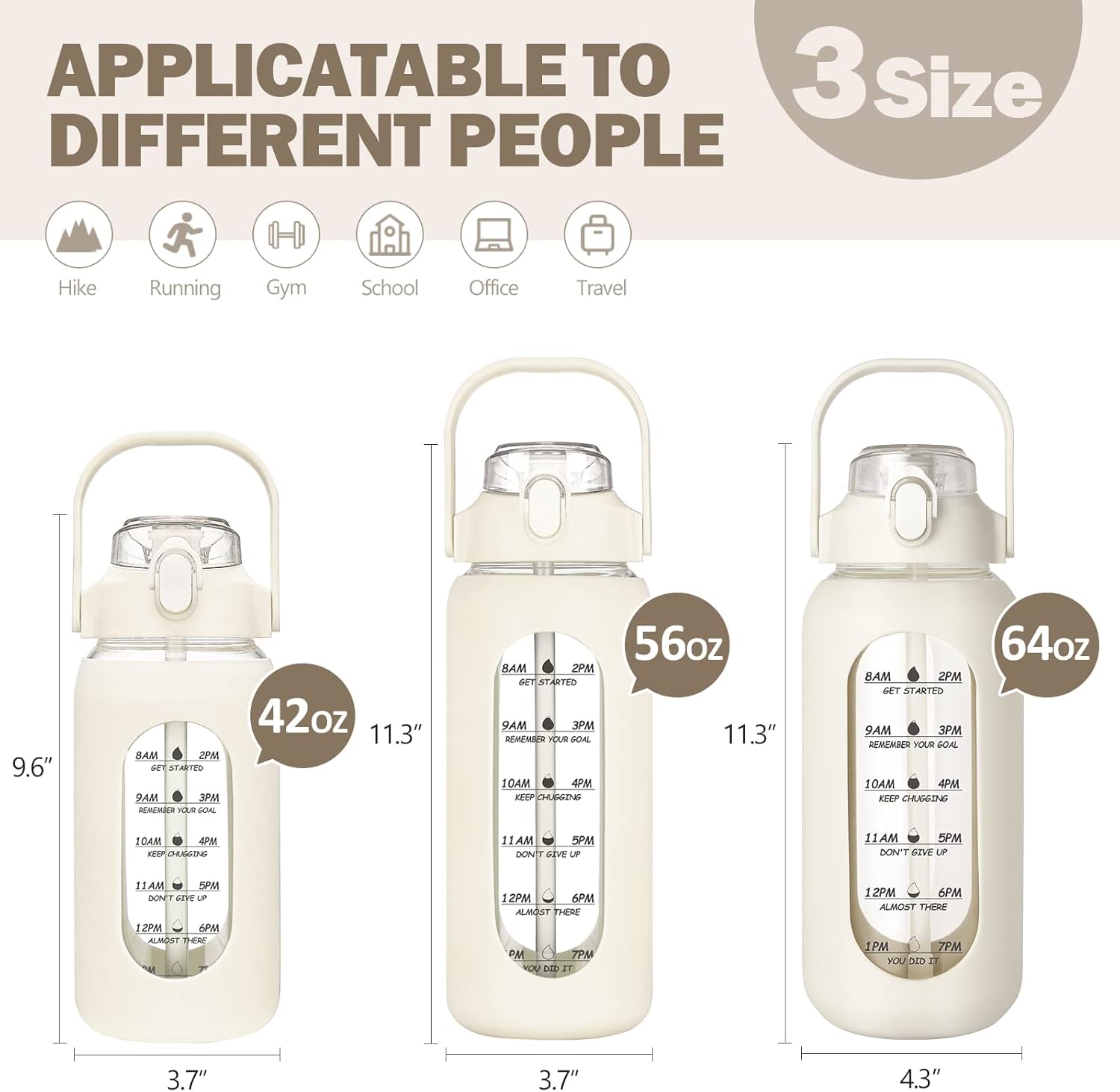 - ❤High-Quality Borosilicate Glass Bottle- This large motivational water bottle is made of odorless, quality, borosilicate glass. Straw and lid are made of food-grade PP, BPA-free and eco-friendly.