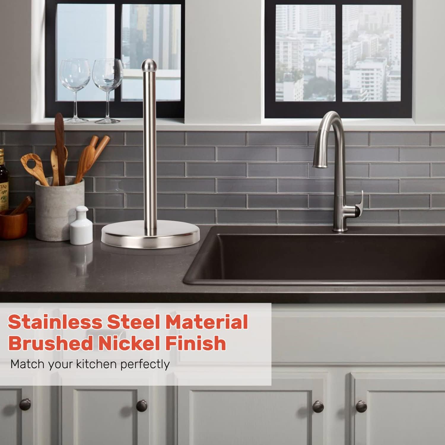 - Nice Addition To Kitchen. Made from brushed nickel stainless steel, the paper towel holder countertop is good looking and elegant. It is not only a practical free standing paper towel holder, but also a great item which is convenient to use in your daily life.