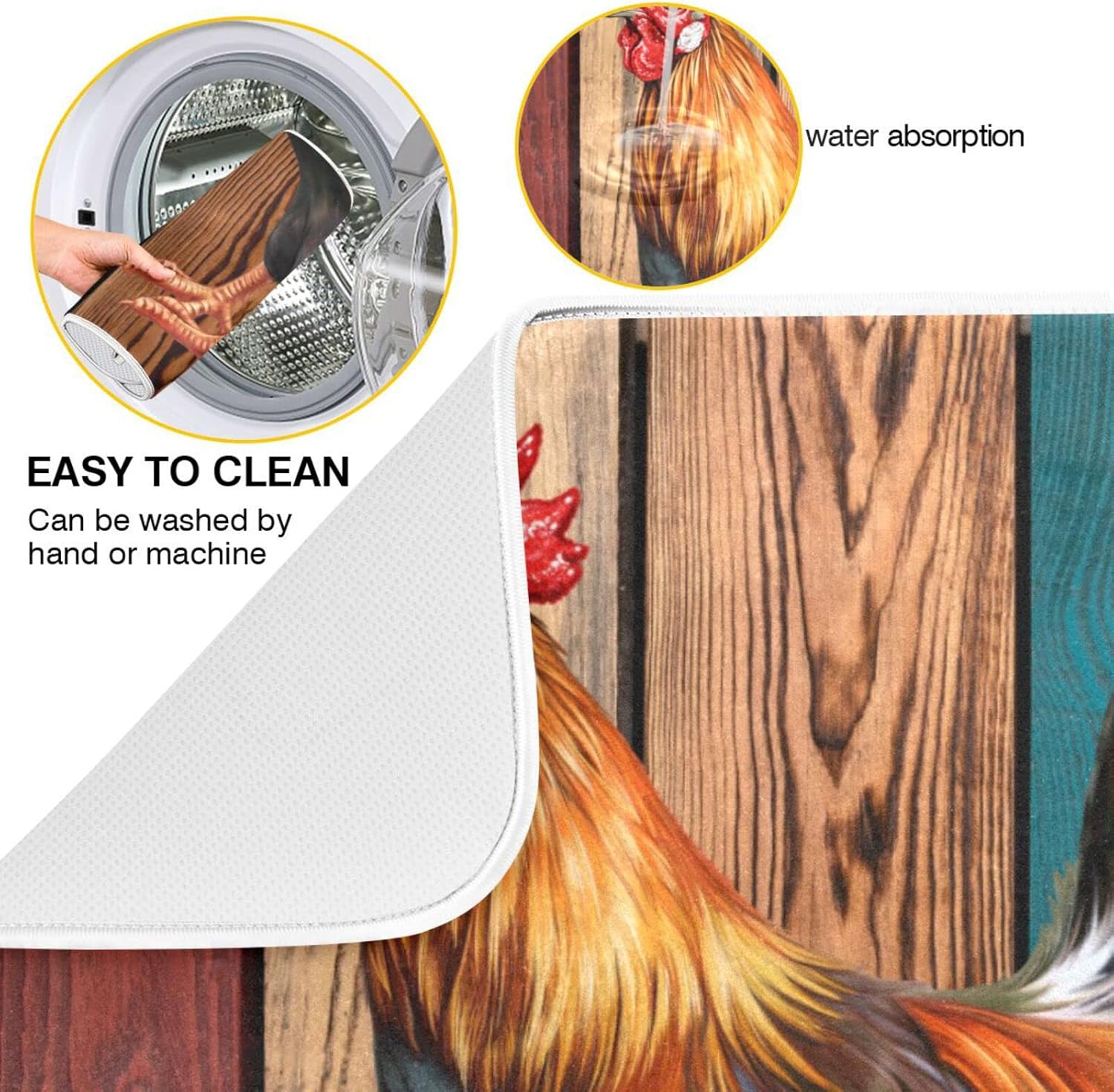 Rooster Dish Drying Mat for Kitchen Counter Farmhouse Absorbent Microfiber Drying Pad, Large 18x24 in, Reversible Drainer Mats