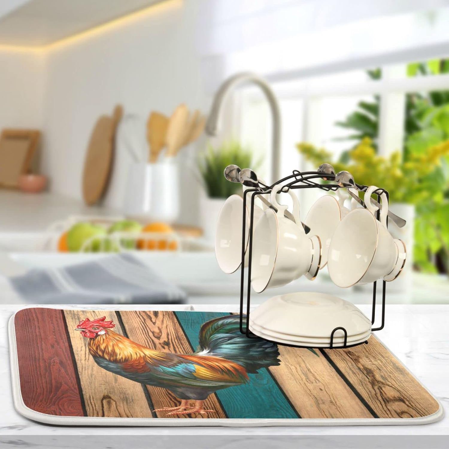Rooster Dish Drying Mat for Kitchen Counter Farmhouse Absorbent Microfiber Drying Pad, Medium 16x18 in, Reversible Drainer Mats