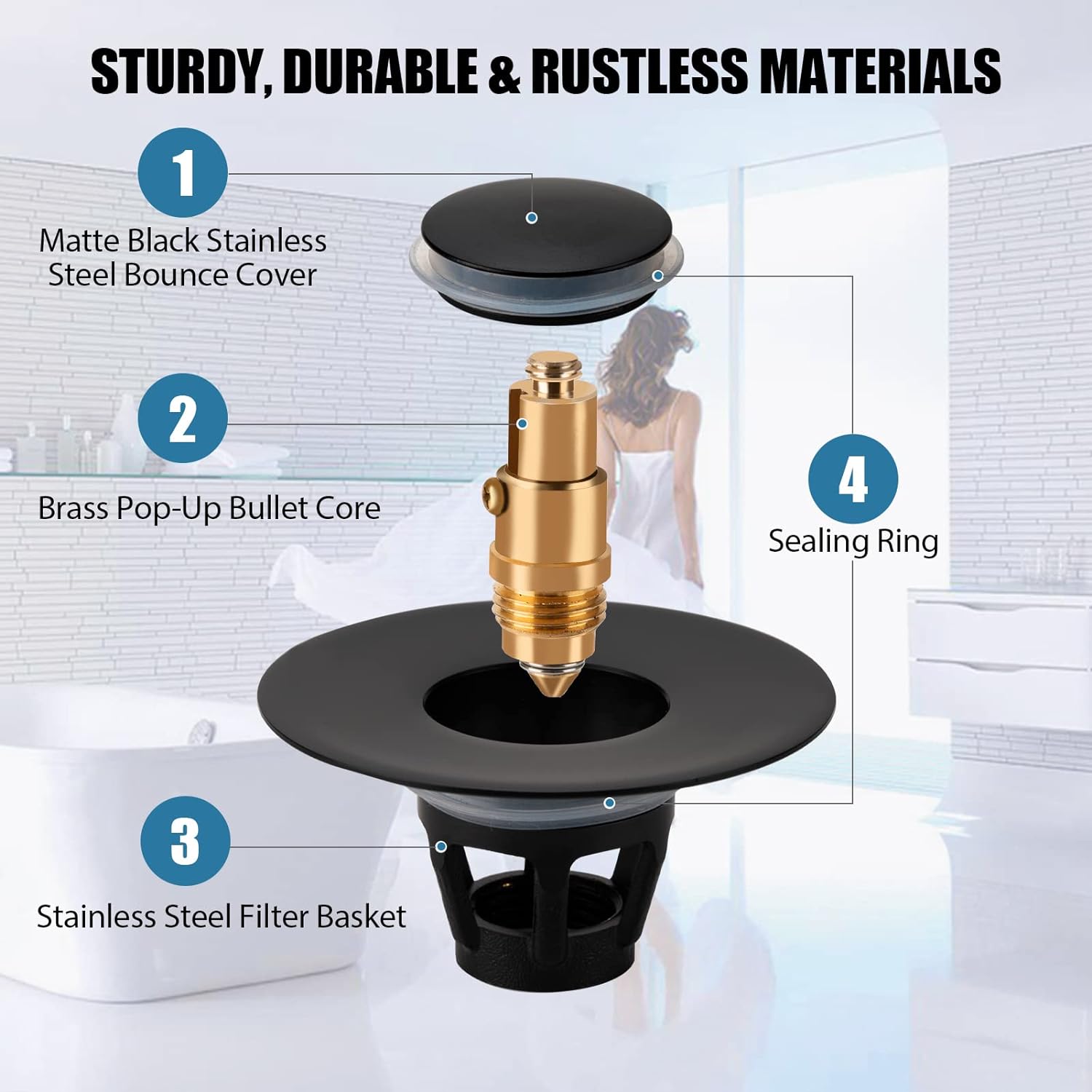 Three colors Bathroom Sink Stopper, 1.1-1.5" Bathroom Sink Strainer, Universal WashBasin Pop Up Drain Stopper, Bounce Core Push Type Sink Plug, Anti-Clogging, Stainless Steel (Matte Black,1PCS)
