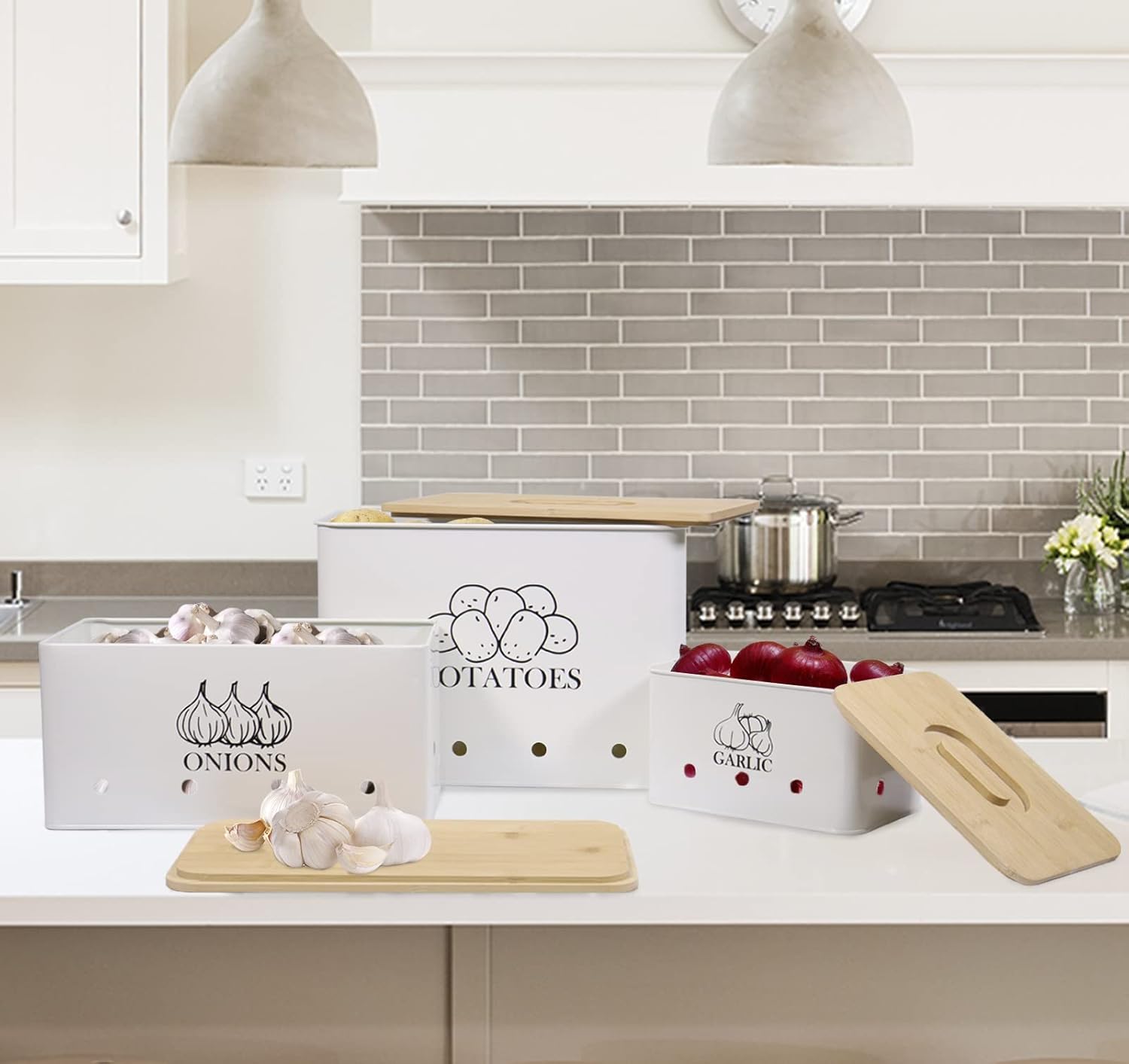 - HIGH CAPACITY - With a deep storage area, the storage tin should have more than enough capacity to cater to your average home cooked meals, each bin has a matching lid. Potato onion garlic canisters jars also can storage garlic, vegetables and fruit etc.
