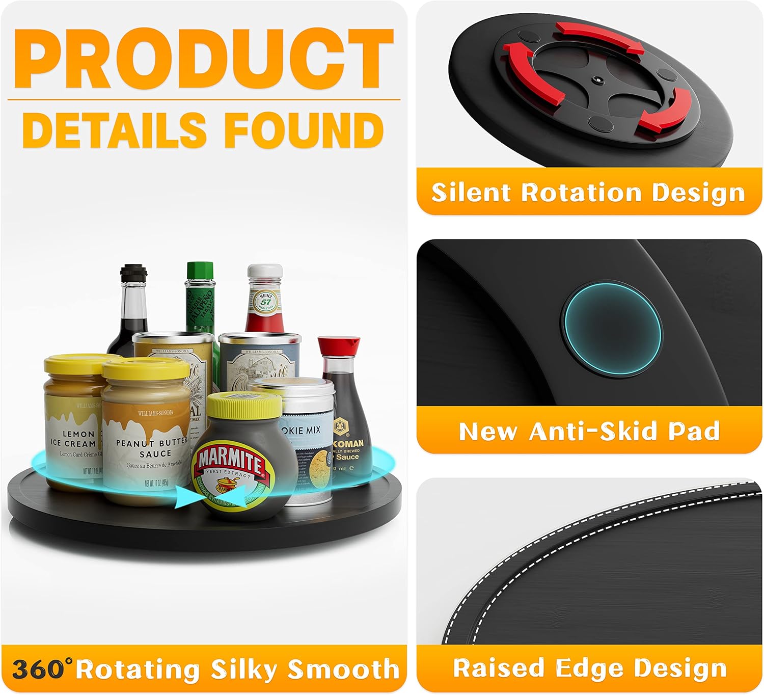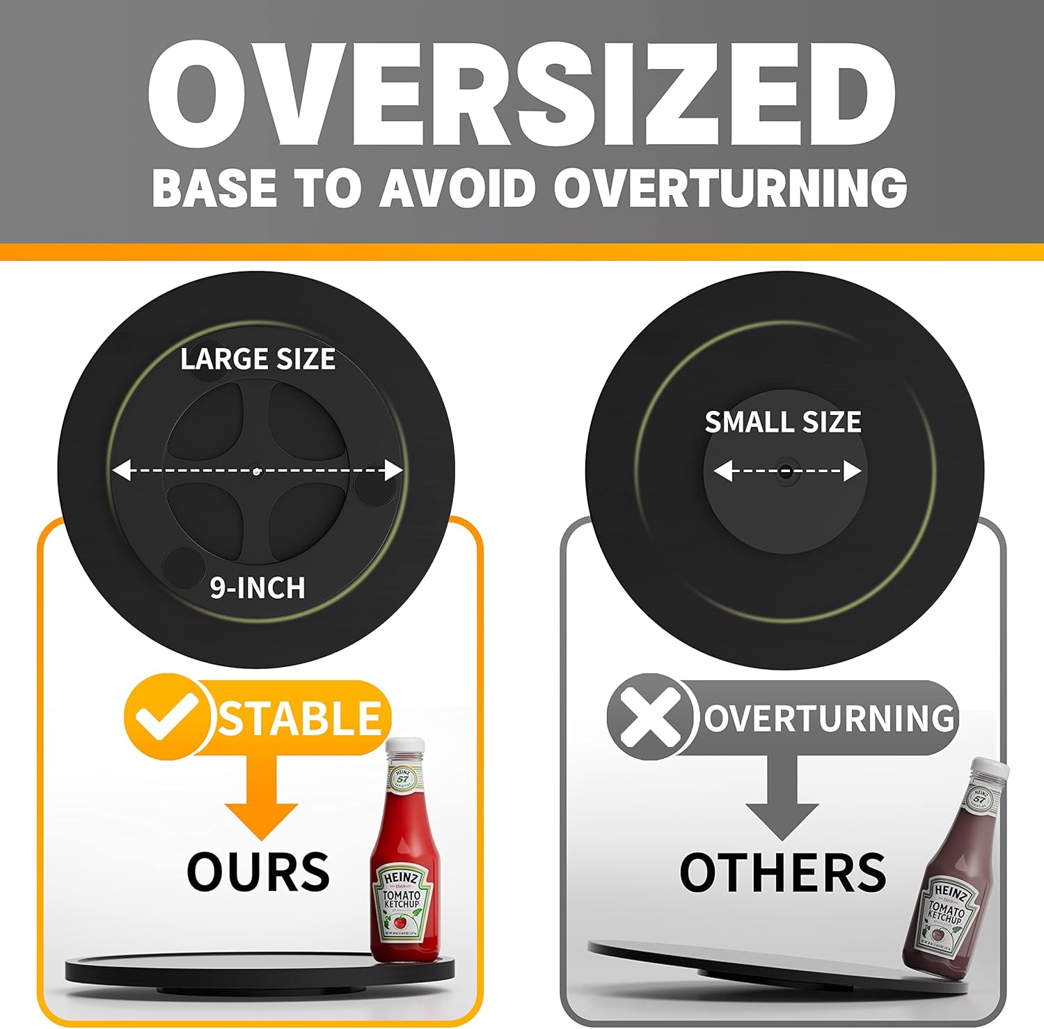 - ✔️【UPDATED DESIGN】Higher quality swivel base will enjoy the ultimate in comfort and convenience that a smooth and silent rotation will bring, compared to other products, our bottom swivel section (9") is larger to effectively prevent dumped items. Will not be like other lazy Susan, because of uneven gravity makes it difficult to rotate.