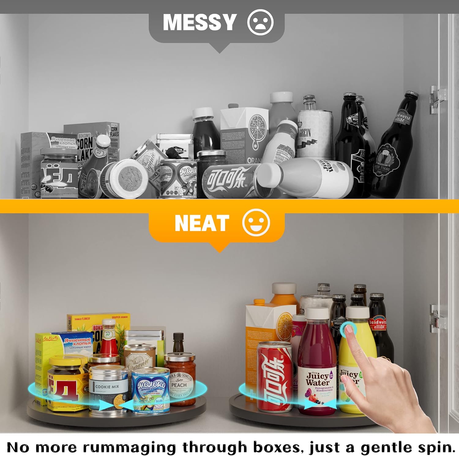 - ✔️【EASY TO REACH FROM ANY SIDE】This Lazy susan is 360-Degree turntable, which makes it ideal for cabinets or counters. Especially in corner cabinets and deep base cabinets where items can be hard to reach, always convenient to get things from upper shelves or corner cabinet just by a simple spin!