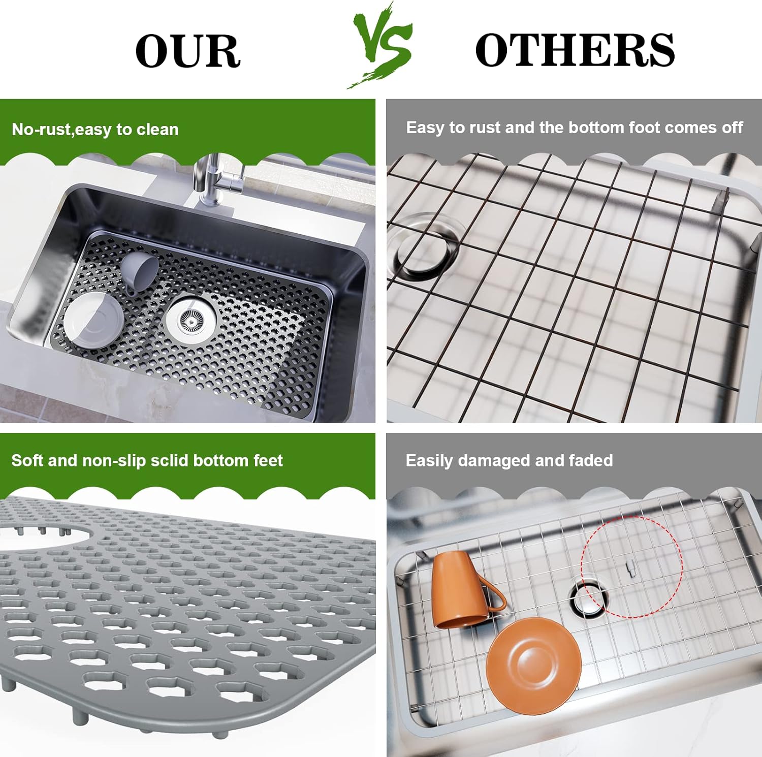 - Raised & Solid Bottom Feet -Our kitchen sink mat can ensure utensils dry faster and a zoned design makes cookware more stable and catch the food residue and drains water. If you are looking for sink mats for the bottom of the kitchen sink or a kitchen good helper for your utensils, bowls, and plates, do not miss this silicone dish protector.