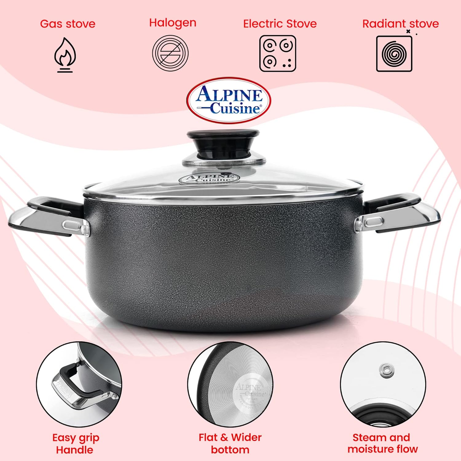 Alpine Cuisine 2.2 Quart Non-stick Stock Pot with Tempered Glass Lid and Carrying Handles, Multi-Purpose Cookware Aluminum Dutch Oven for Braising, Boiling, Stewing
