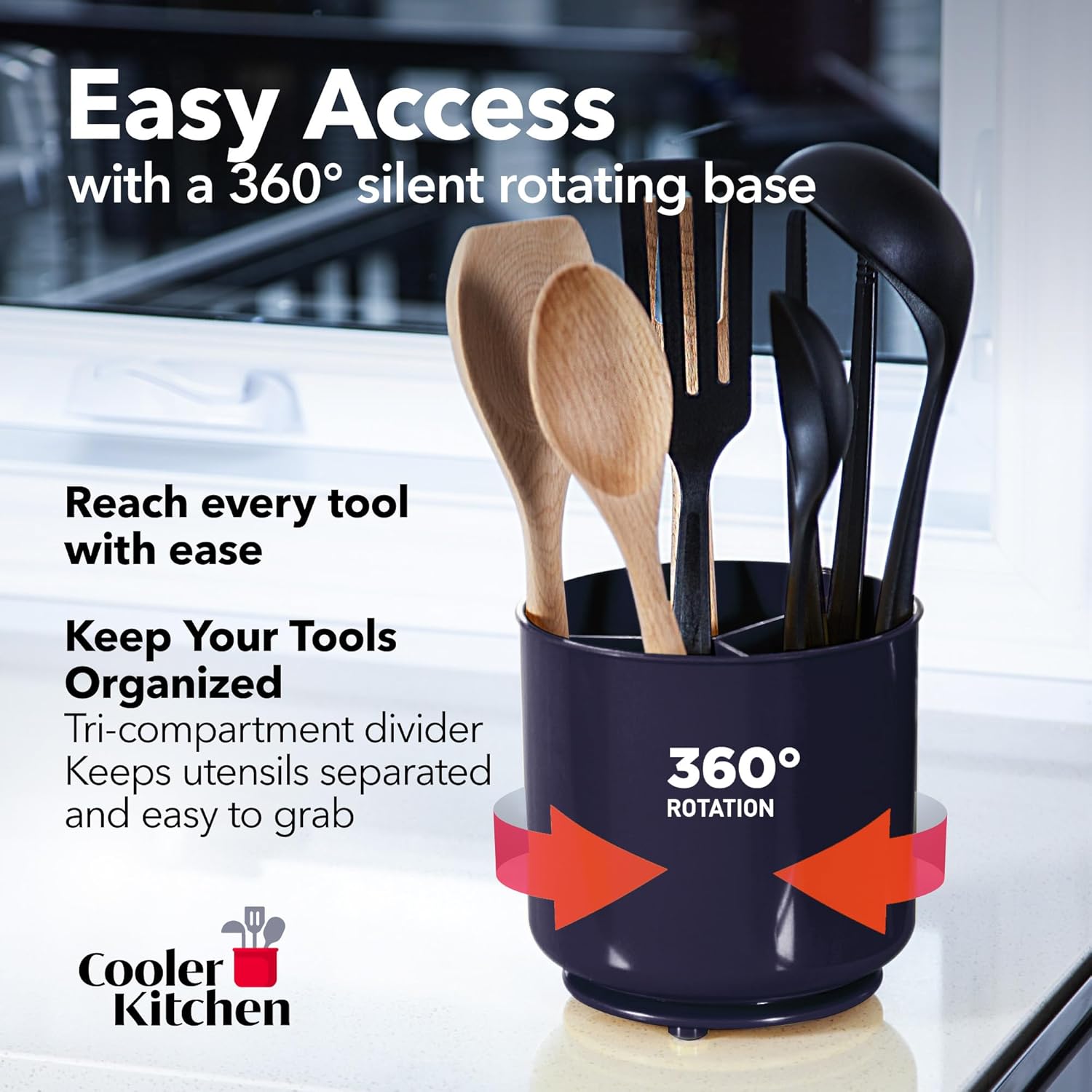 - PERFECT ROTATING DESIGN - Features include 1) Rotating base so you can reach every tool with ease 2) A tri-compartment divider to organize your tools more efficiently 3) A gripped insert at the bottom to prevent sliding during use 4) rubberized feet, so it won't scratch or stain your counter.