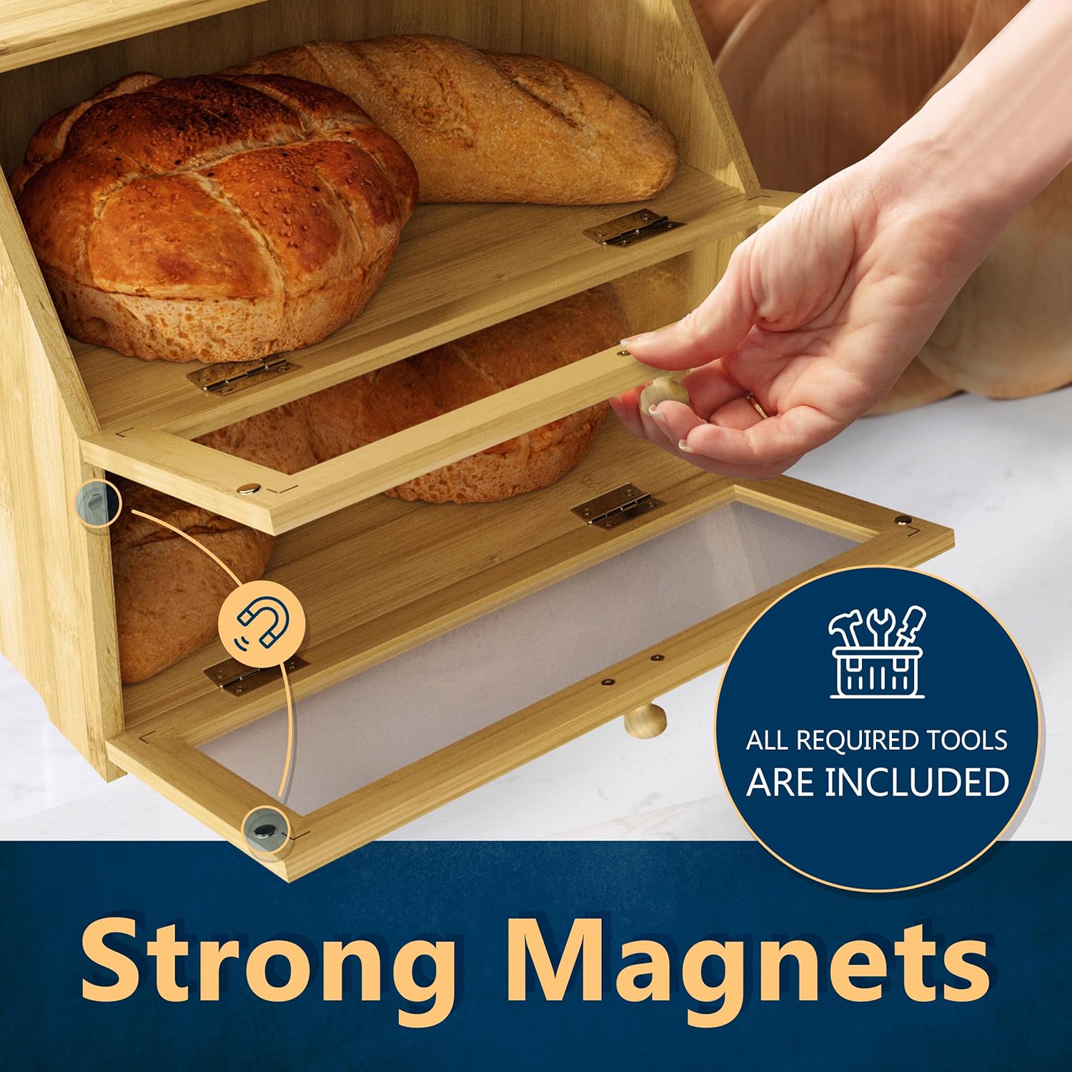 Bamboo Bread Box Space Saving Rustic Flat-Top Bread Bin for Countertop - Store Bread Cake and Baked Goods - 15 x 9.8 inches (2 Tier box)
