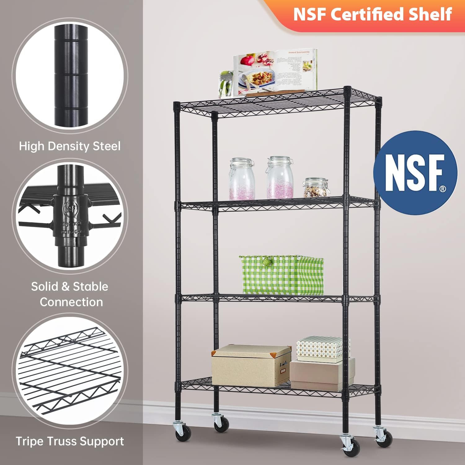 FDW Wire Shelving Storage Shelves 4-Shelf Adjustable NSF Wire Shelf Heavy Duty Storage Shelving Unit on 3” Wheel Casters Commercial Metal Rack 36L x 14W x 62H,Black