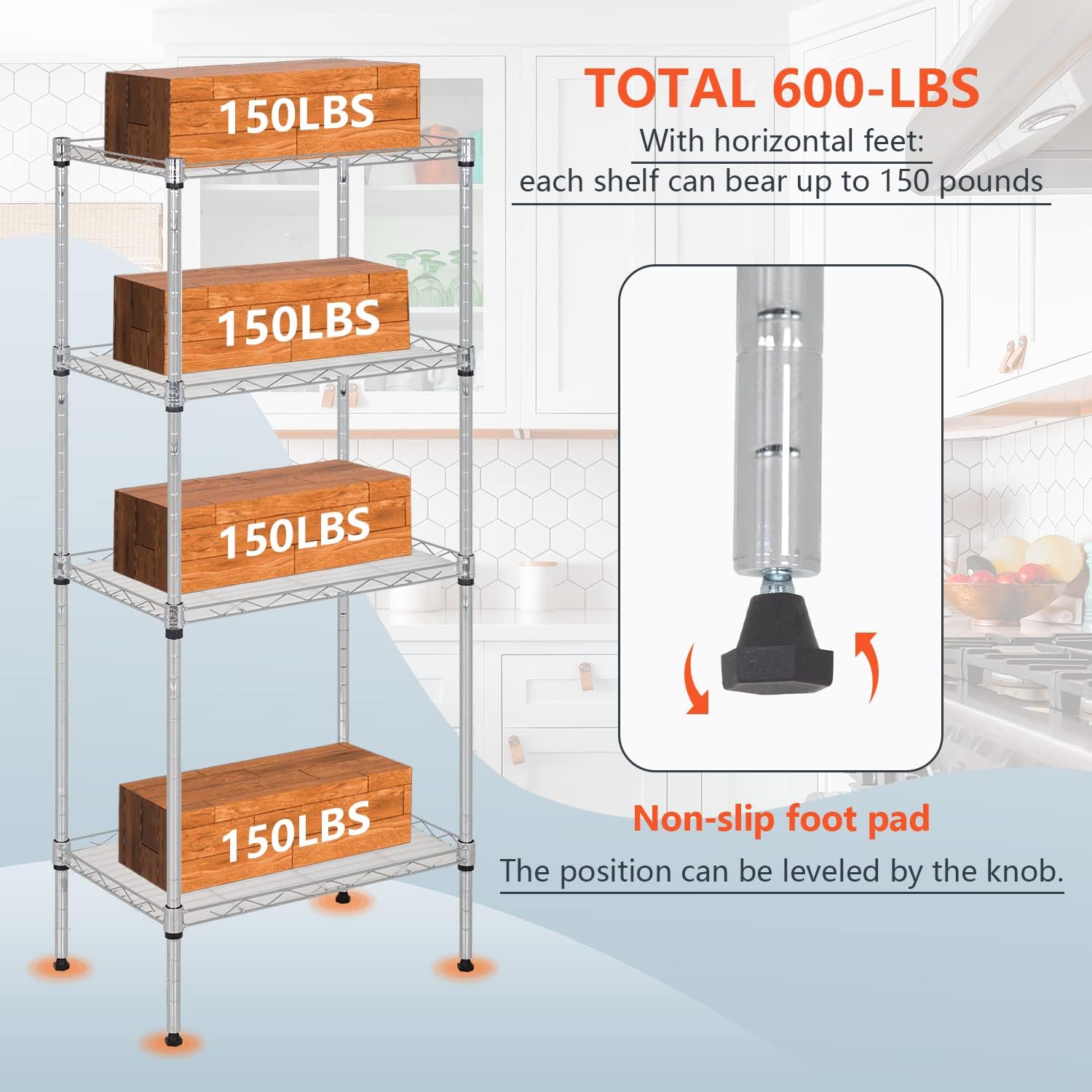 - ✔【STRONG WEIGHT CAPACITY】 Each shelving can hold 150 pounds (evenly distributed), and the total maximum load weight of the storage shelves for small places is 600 pounds. The shelves for storage for kitchen can put some commonly used living objects on it without worrying about the deformation of the storage shelves.